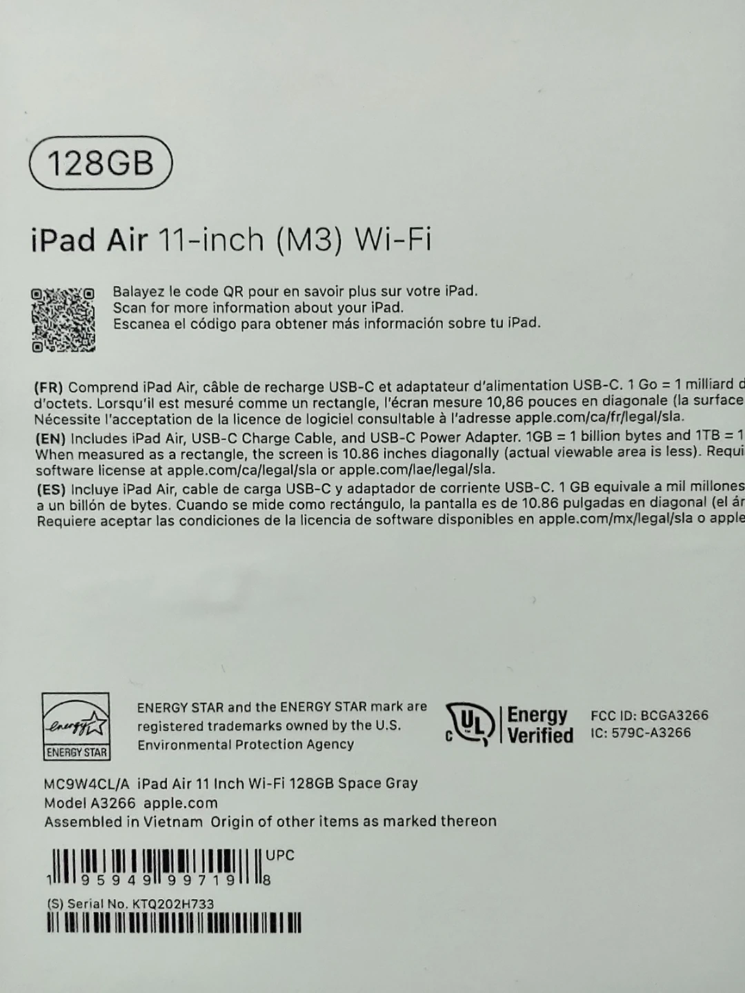 Apple iPad Air 11-inch (M3) Wi-Fi with 128GB storage in Space Gray. It includes the iPad, USB-C Charge Cable, and USB-C Power Adapter. The screen is 10.86 inches diagonally.
