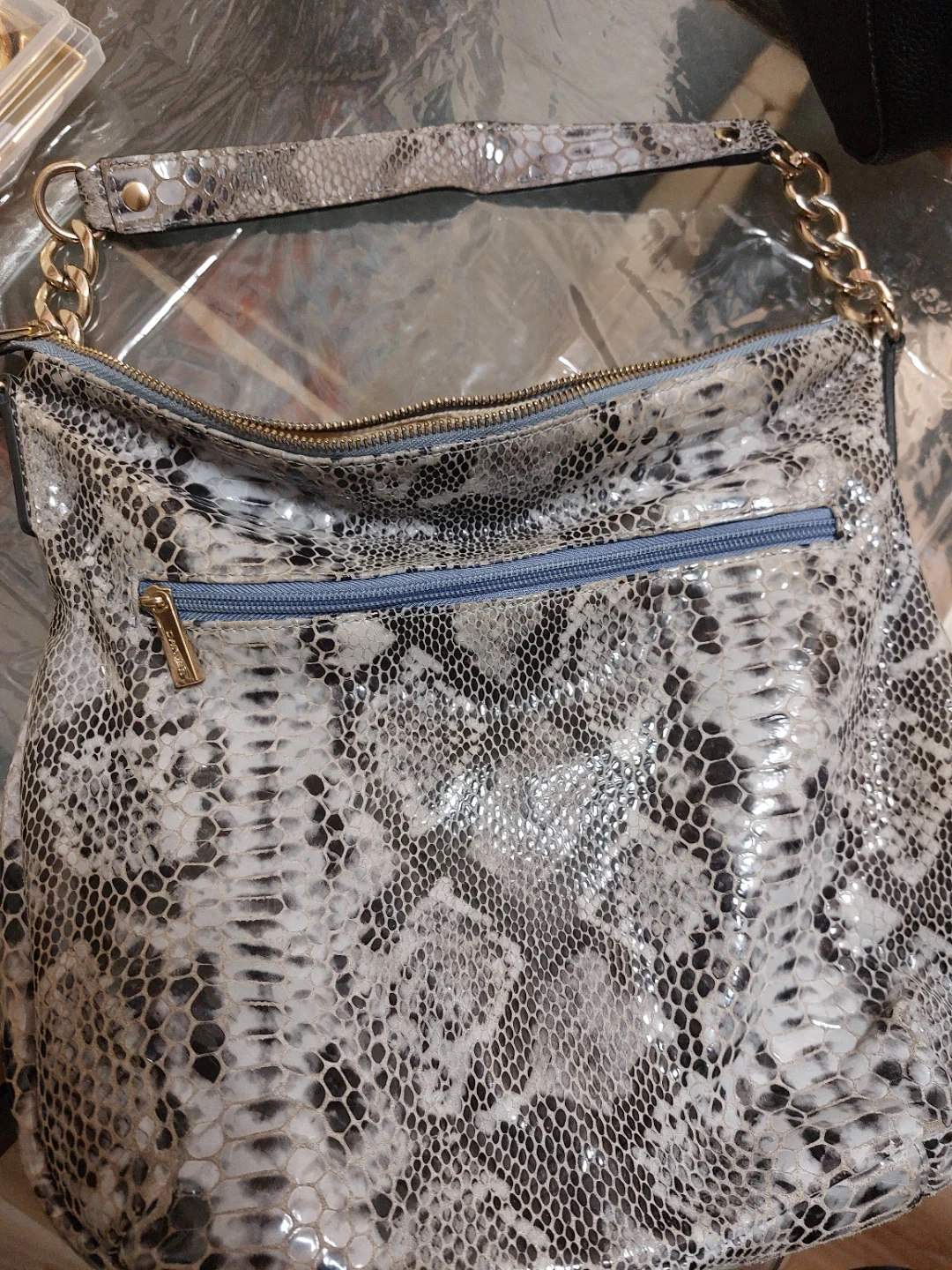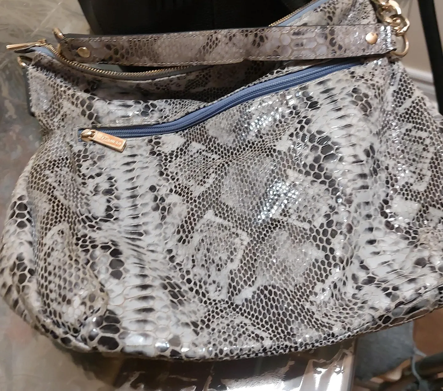DANIER women's shoulder bag featuring a snakeskin print. It's got multiple compartments inside for organization. The faux leather material is durable and easy to clean. This bag is great for everyday use!