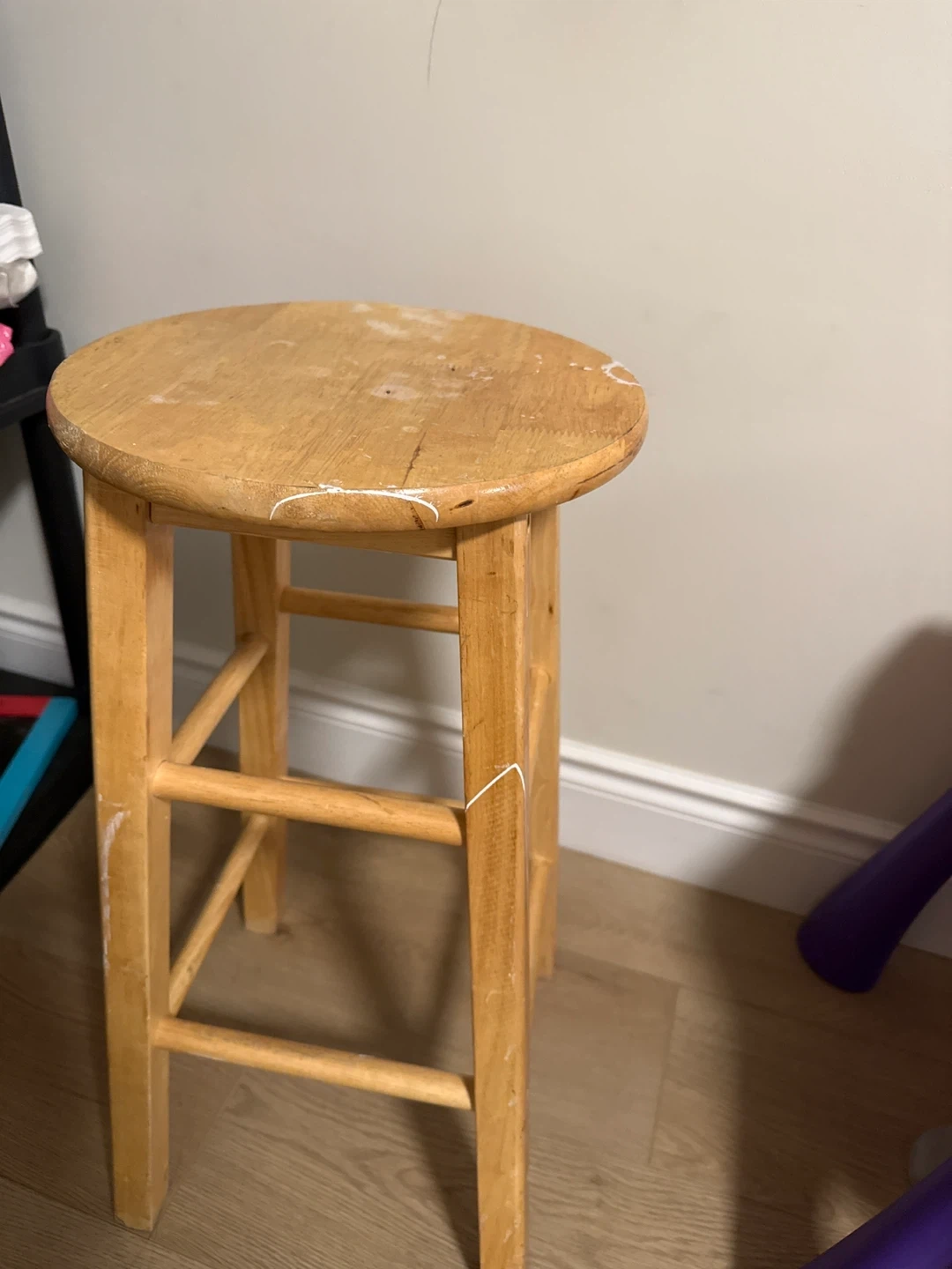 This is a wooden bar stool with a natural wood finish. It has a simple, sturdy design with four legs and crossbars for support. Some minor scuffs and white marks are visible on the surface and legs, consistent with normal use. This stool would be handy for extra seating at a counter or bar.
