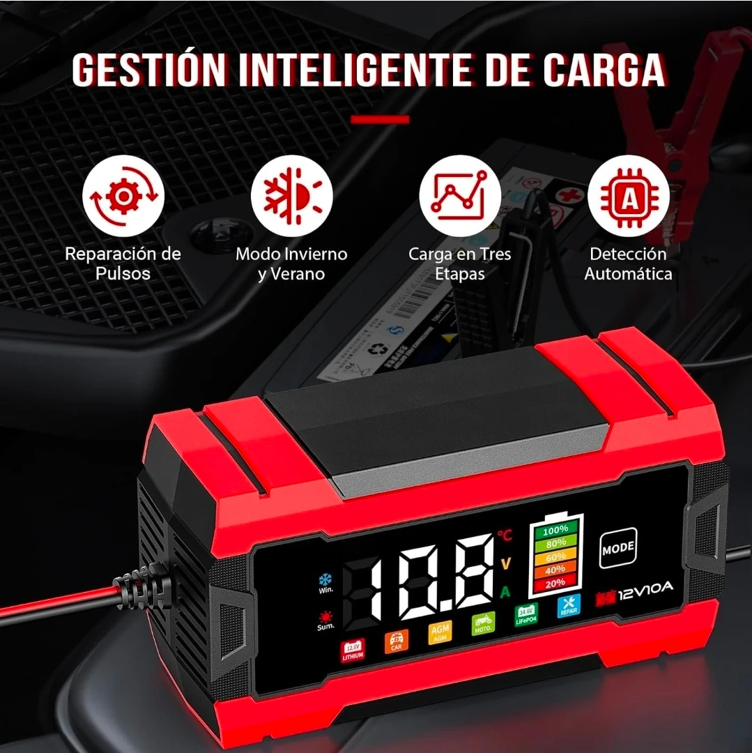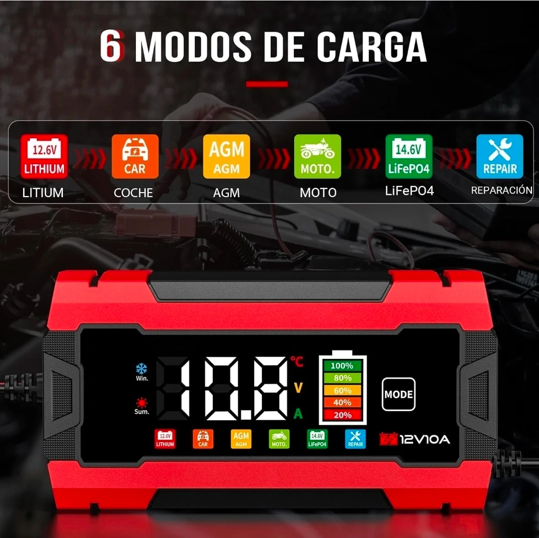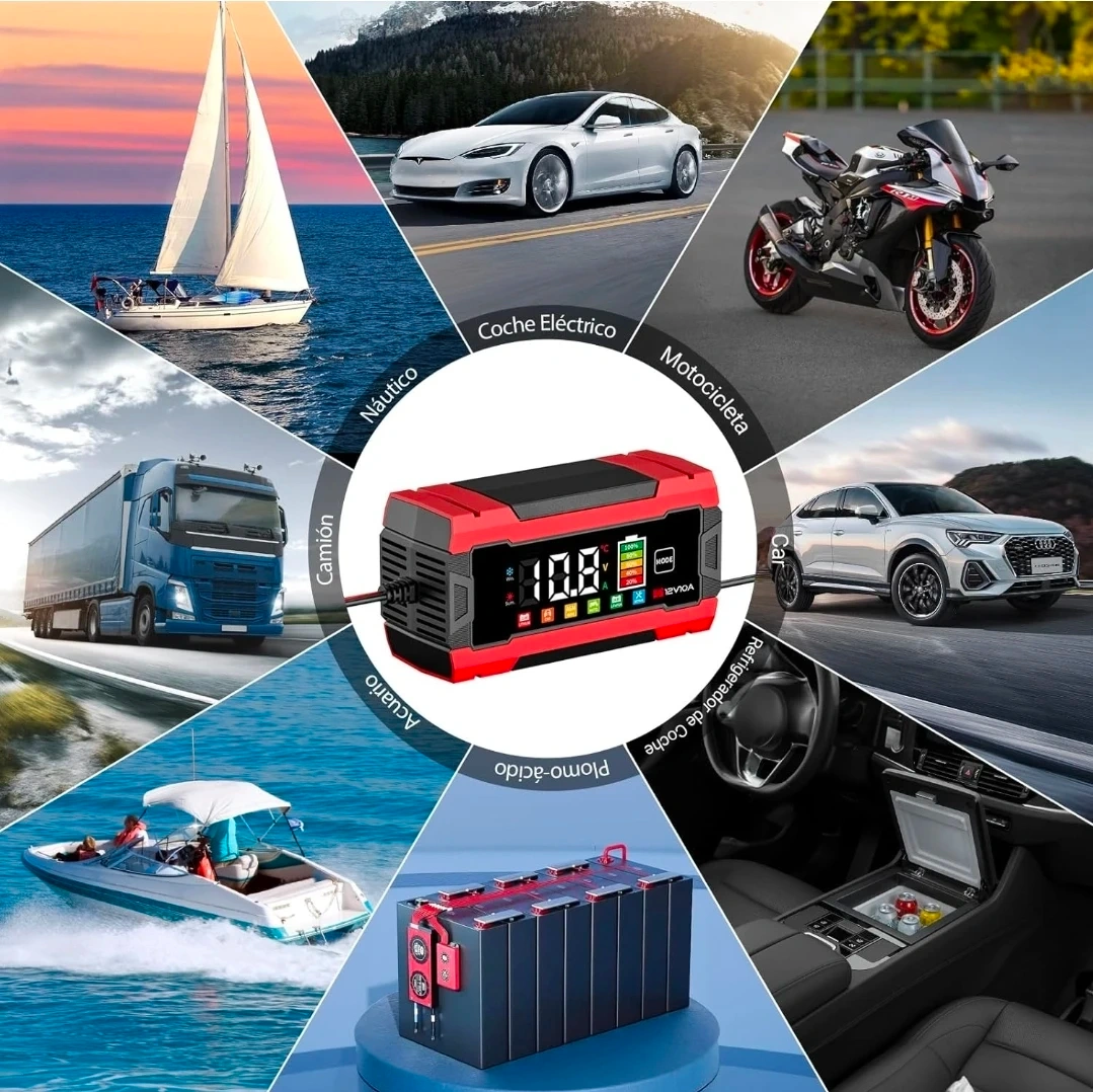 Smart car battery charger with pulse repair function. It has 6 charging modes: Lithium, Car, AGM, Moto, LifePO4, and Repair. Unit displays voltage, current, and battery status in real-time. It's suitable for 2-200 AH batteries.