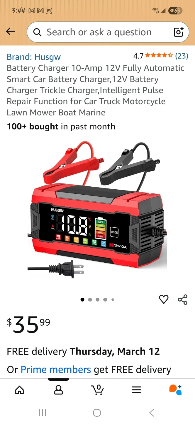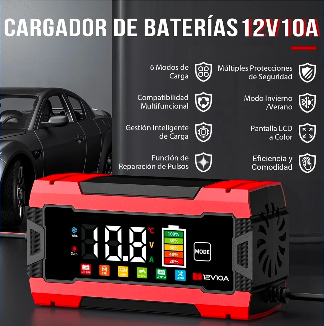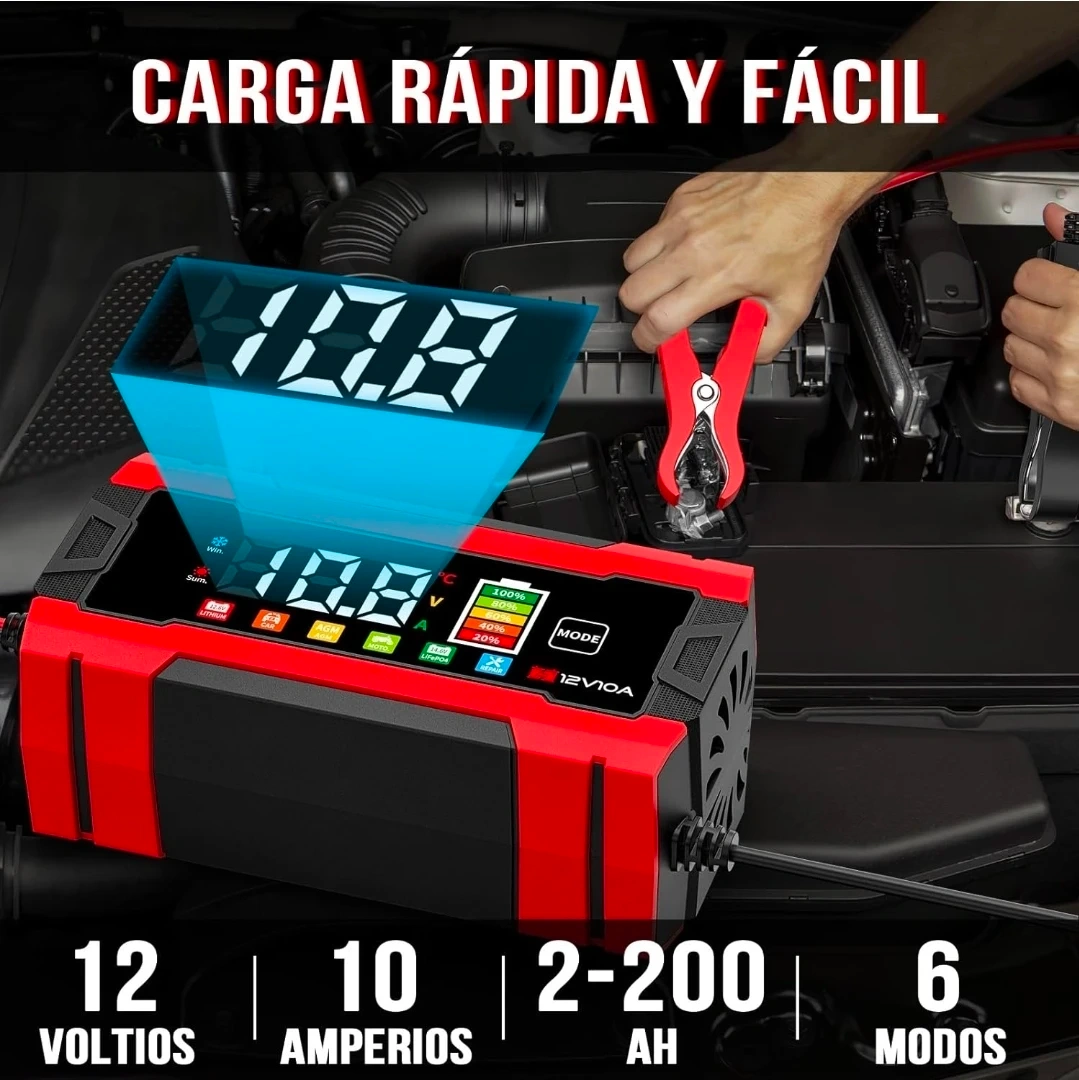 Smart car battery charger with pulse repair function. It has 6 charging modes: Lithium, Car, AGM, Moto, LifePO4, and Repair. Unit displays voltage, current, and battery status in real-time. It's suitable for 2-200 AH batteries.