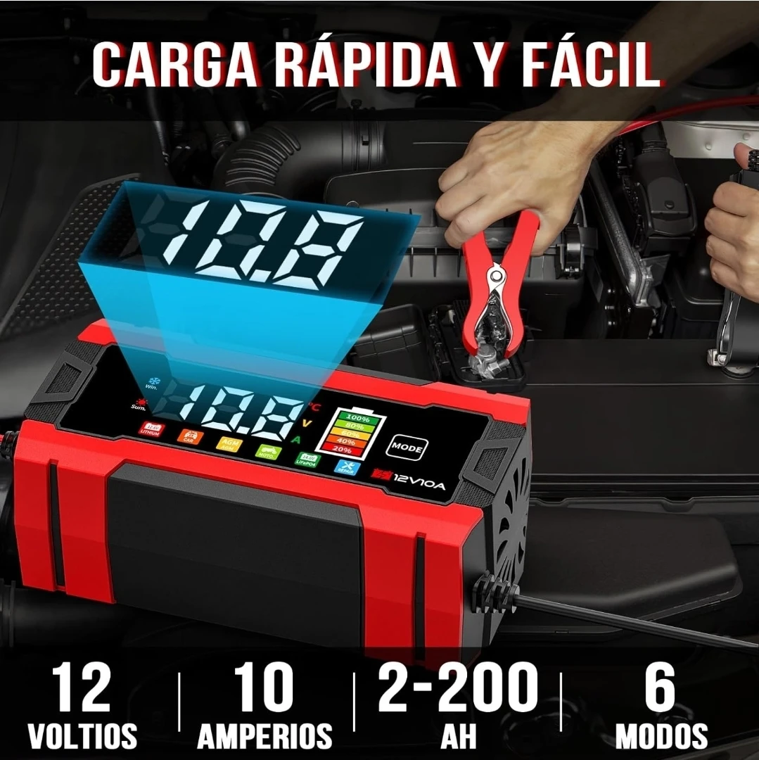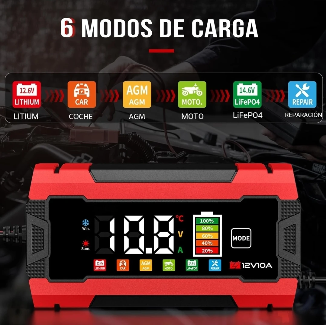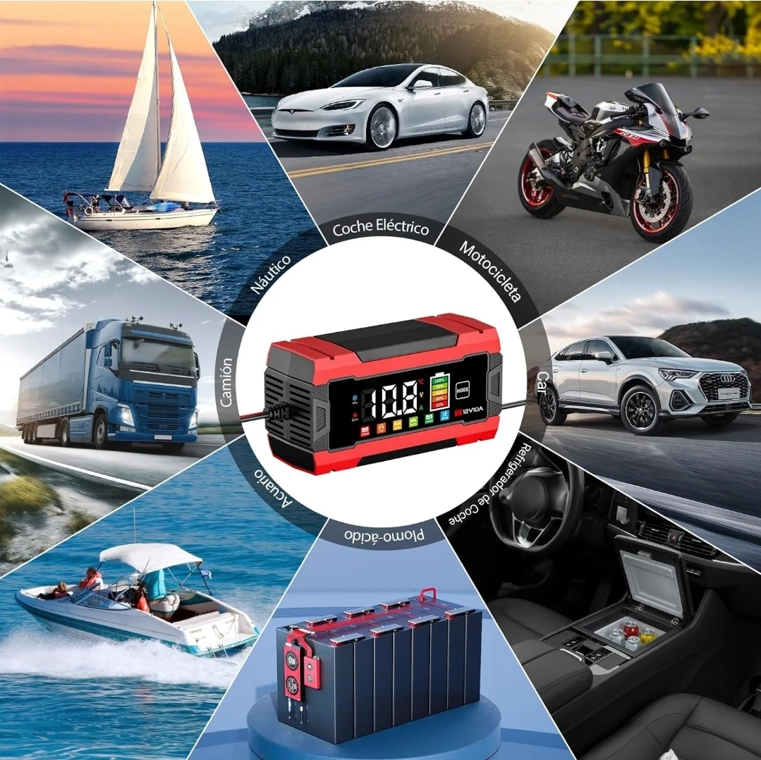 Smart car battery charger with pulse repair function. It has 6 charging modes: Lithium, Car, AGM, Moto, LifePO4, and Repair. Unit displays voltage, current, and battery status in real-time. It's suitable for 2-200 AH batteries.