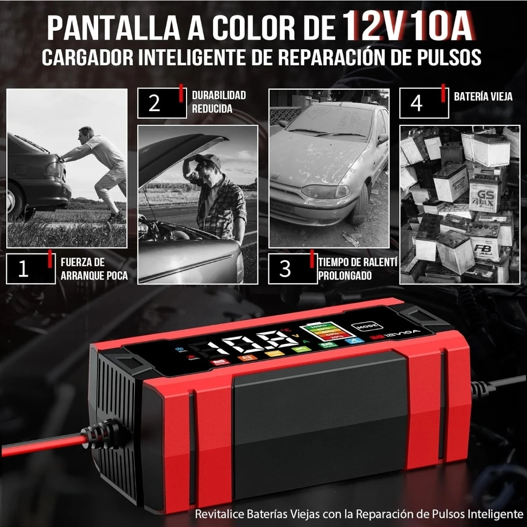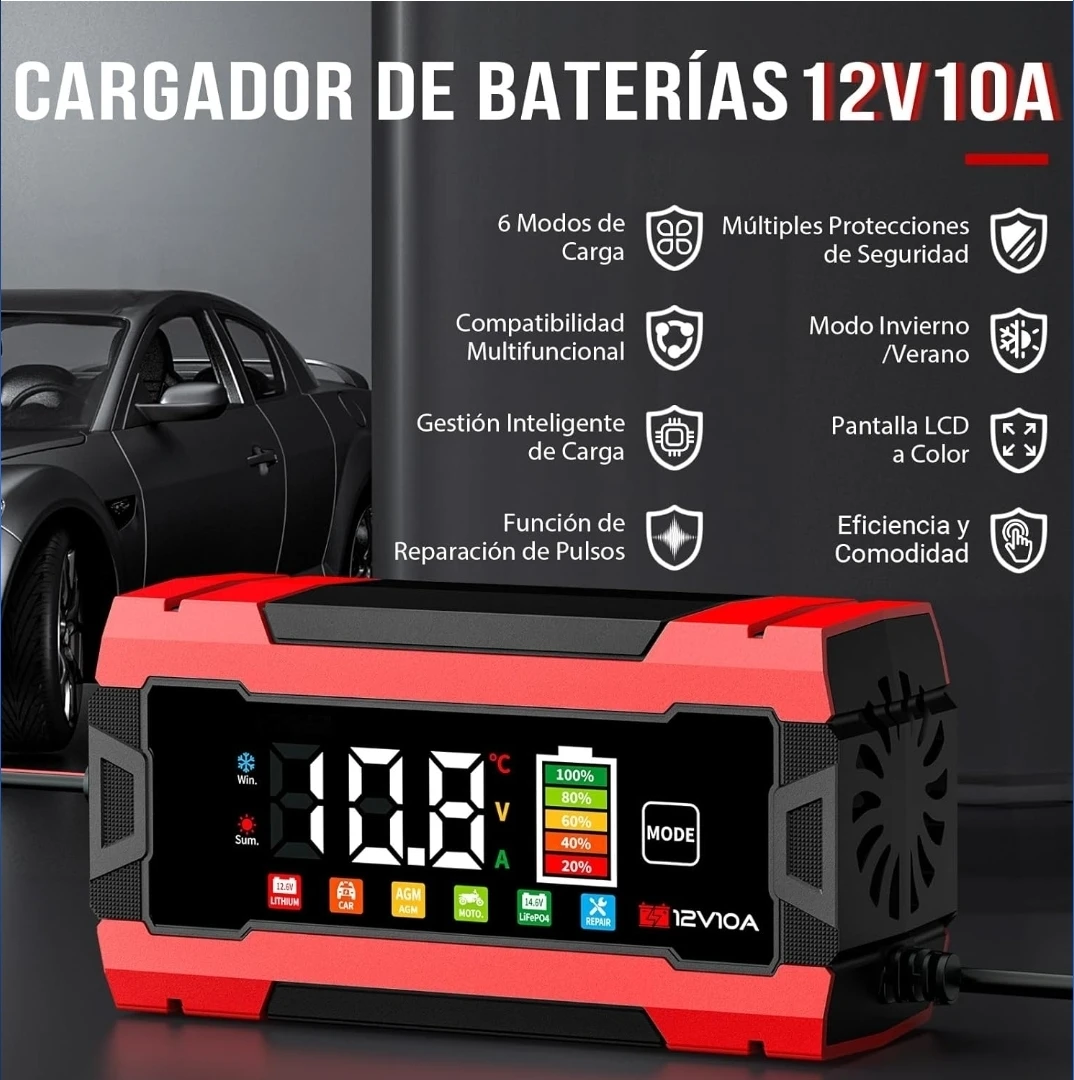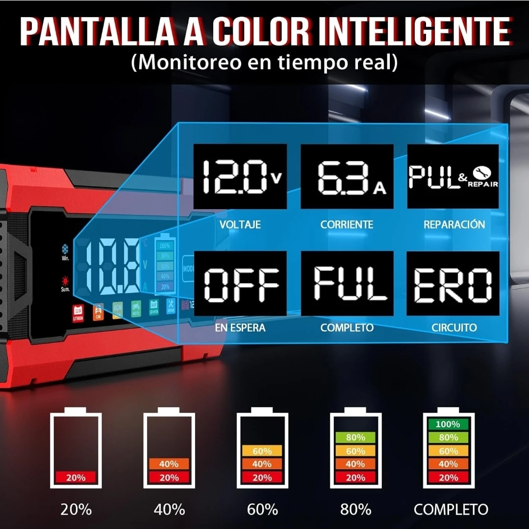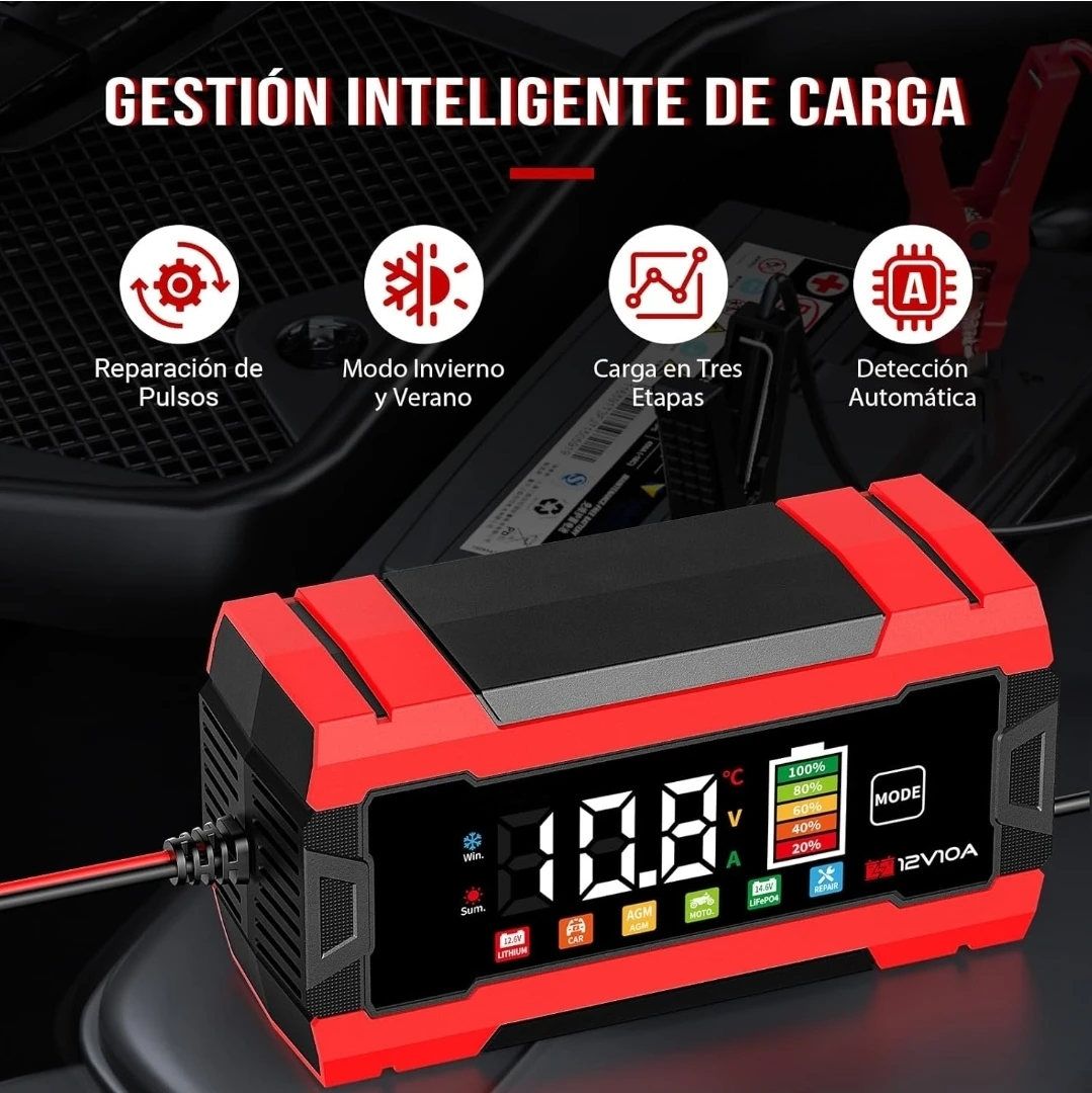 Smart car battery charger with pulse repair function. It has 6 charging modes: Lithium, Car, AGM, Moto, LifePO4, and Repair. Unit displays voltage, current, and battery status in real-time. It's suitable for 2-200 AH batteries.