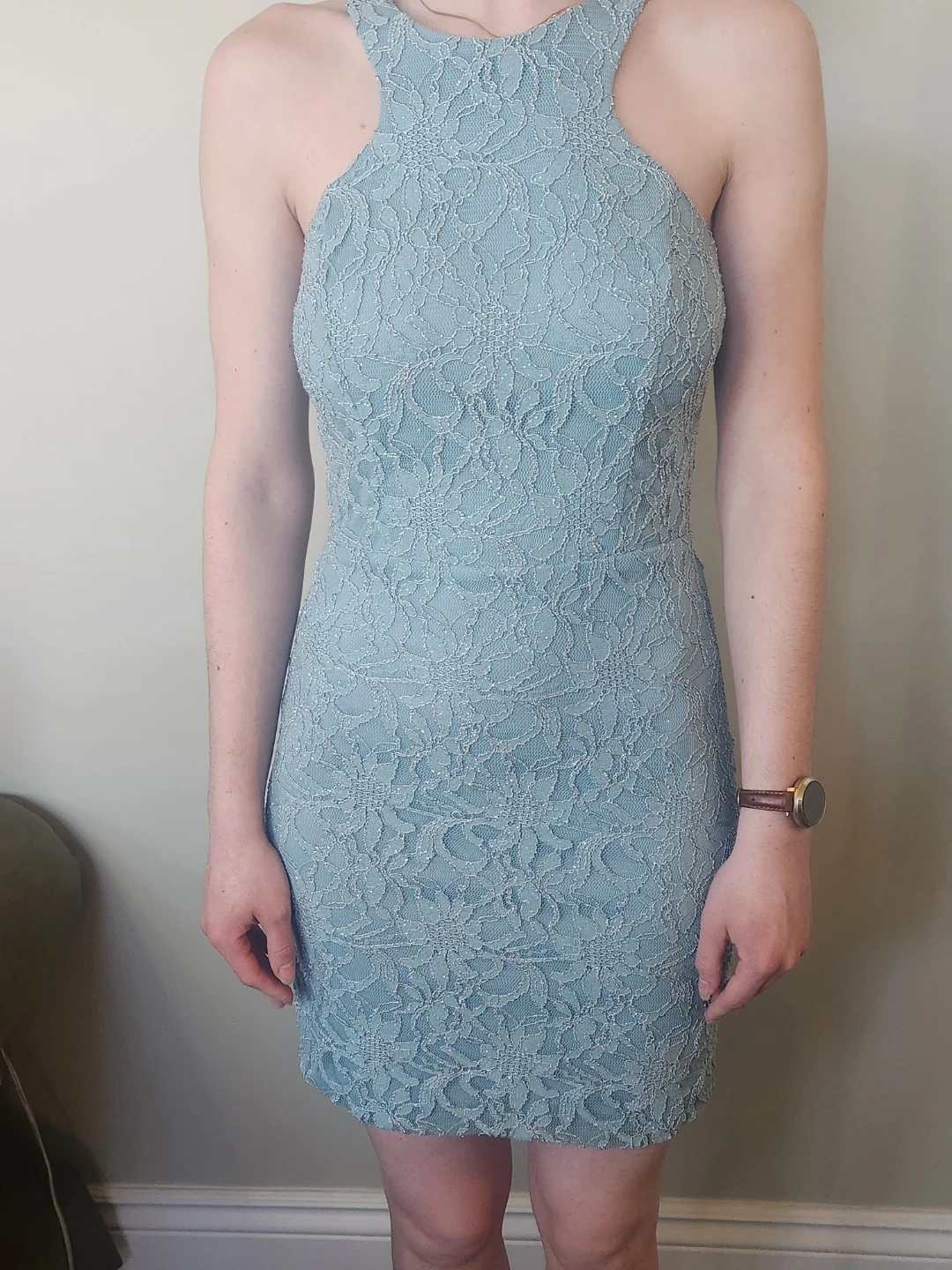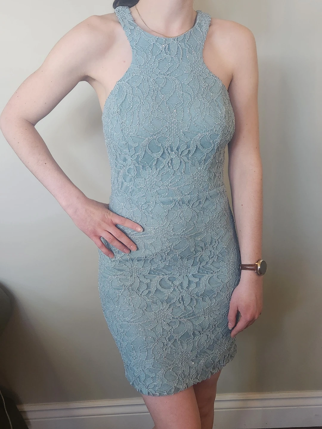 Lovely greenish blue lace bodycon dress features a halter neckline and a cutout detail in the back. It's fully lined with a zipper closure.