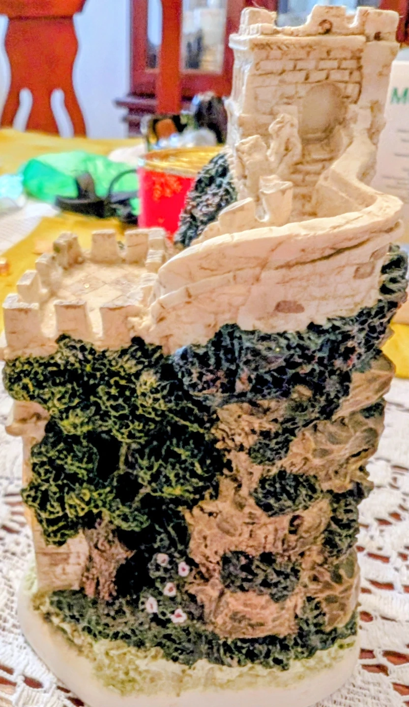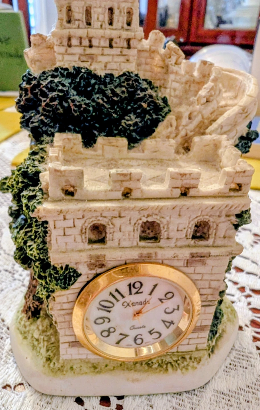 This decorative clock is shaped like a castle on the Great Wall of China. It features a gold-tone bezel and Roman numerals on the clock face. This piece adds a unique touch to any desk or shelf.