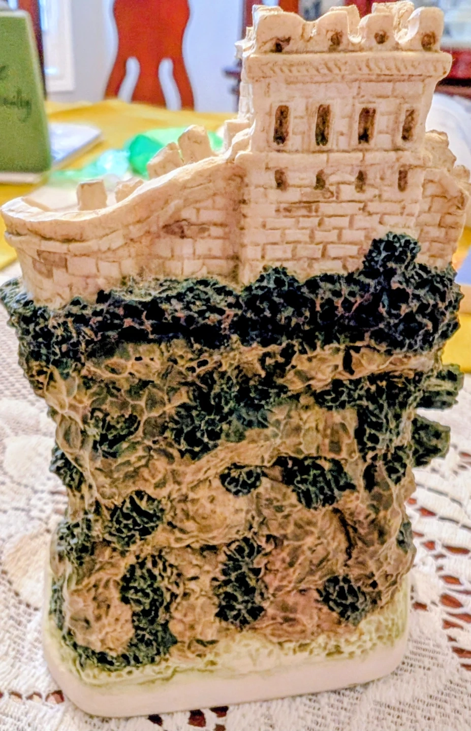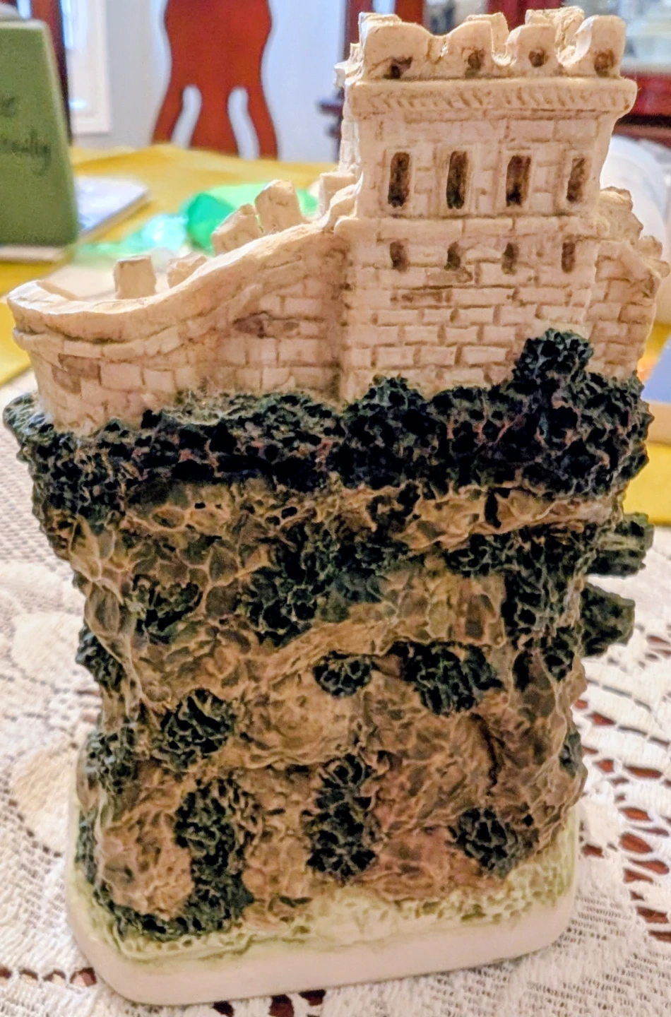 This decorative clock is shaped like a castle on the Great Wall of China. It features a gold-tone bezel and Roman numerals on the clock face. This piece adds a unique touch to any desk or shelf.
