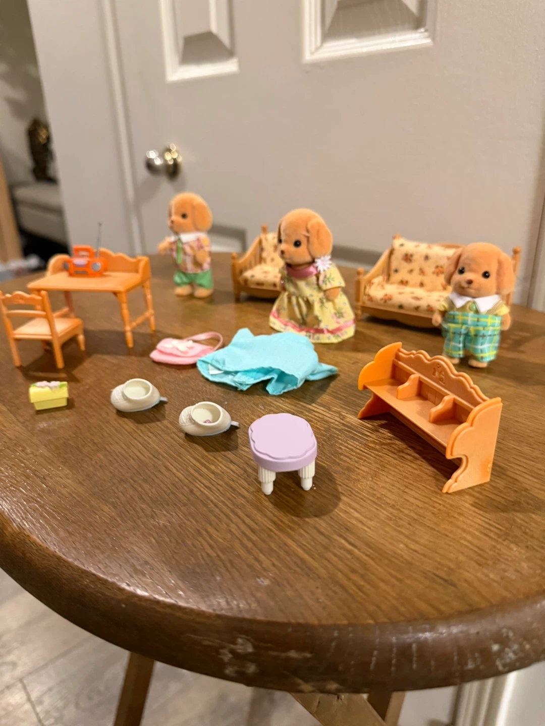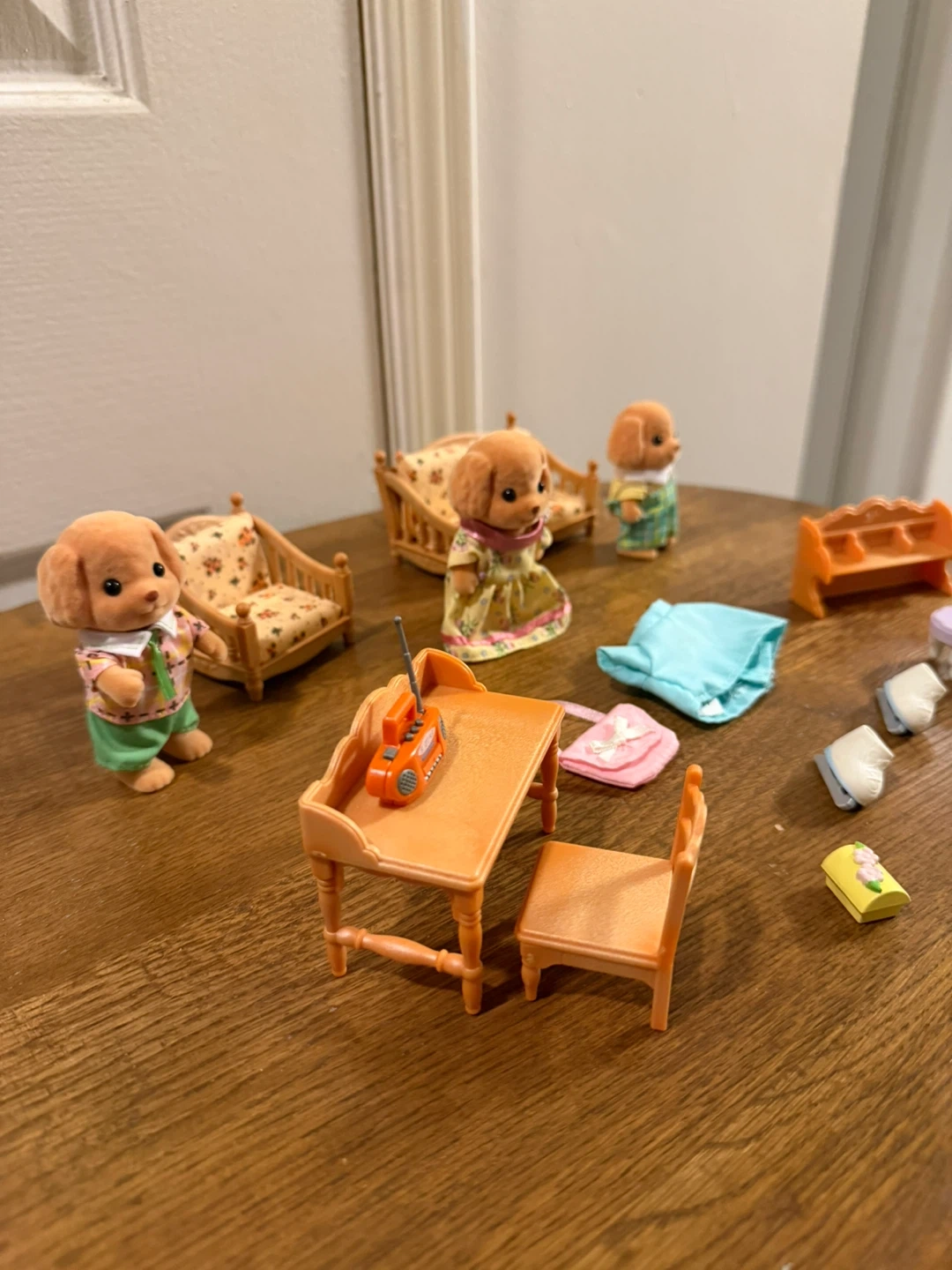 This set includes a family of four dog figures, various furniture pieces like sofas and chairs, and accessories such as a table, radio, and clothing. It's perfect for imaginative play and creating miniature scenes.