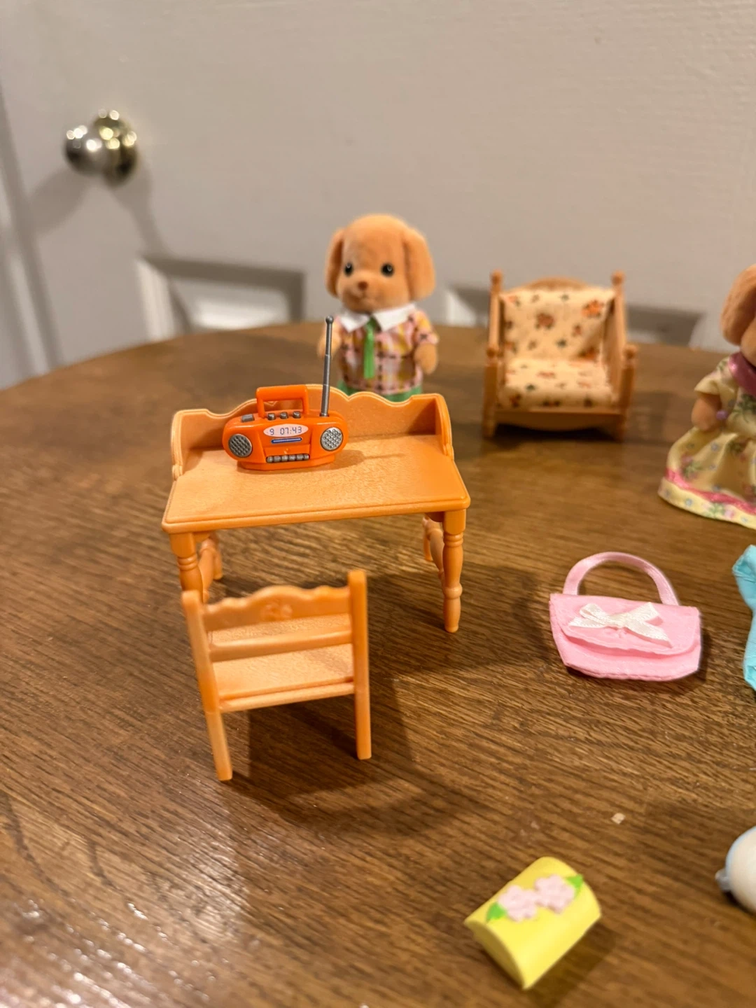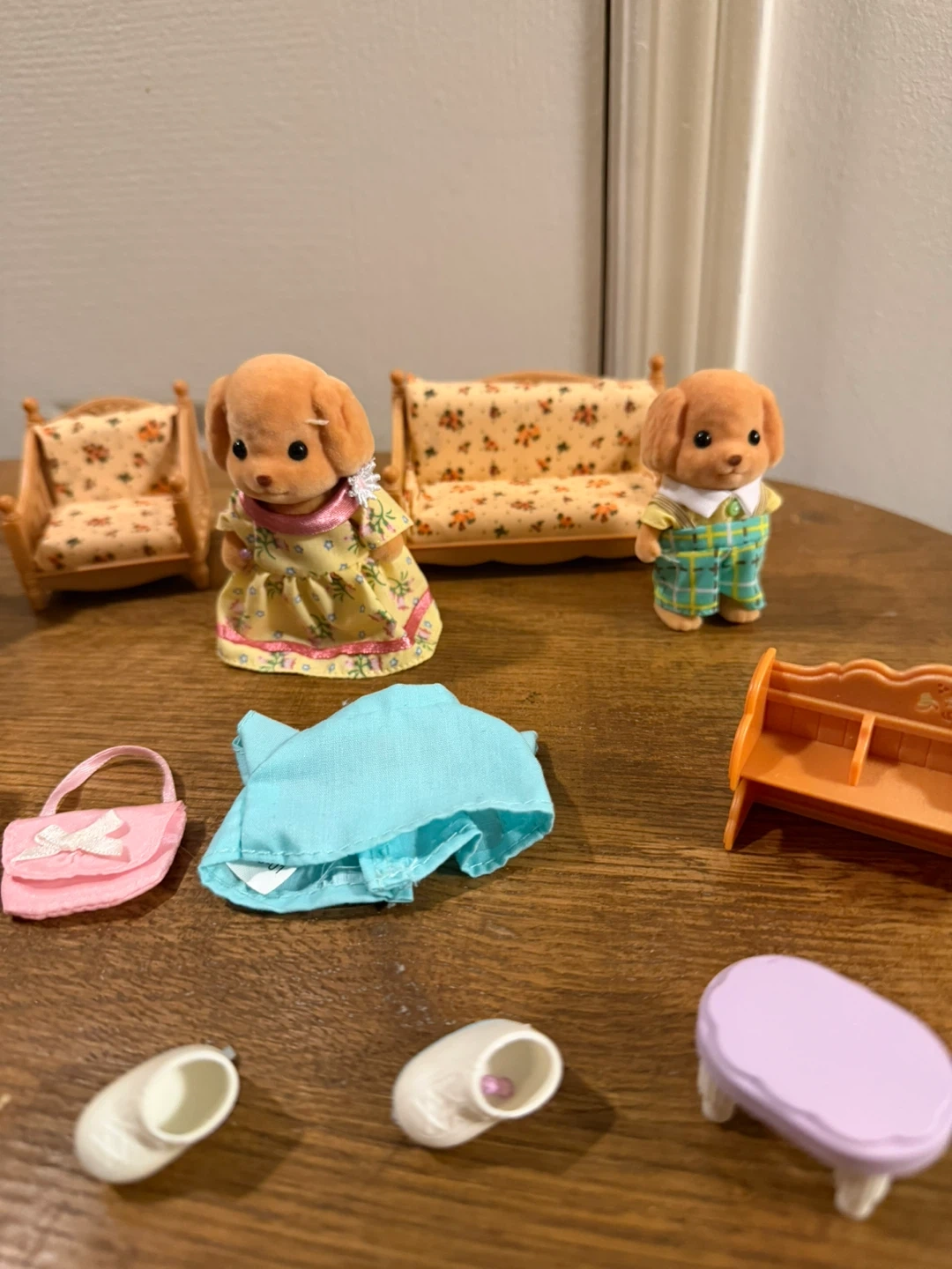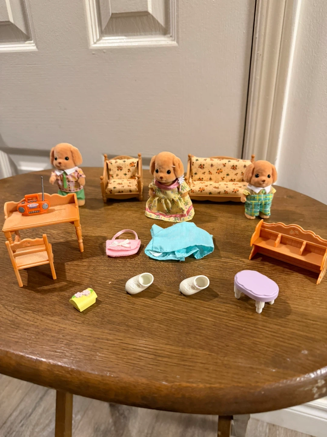This set includes a family of four dog figures, various furniture pieces like sofas and chairs, and accessories such as a table, radio, and clothing. It's perfect for imaginative play and creating miniature scenes.