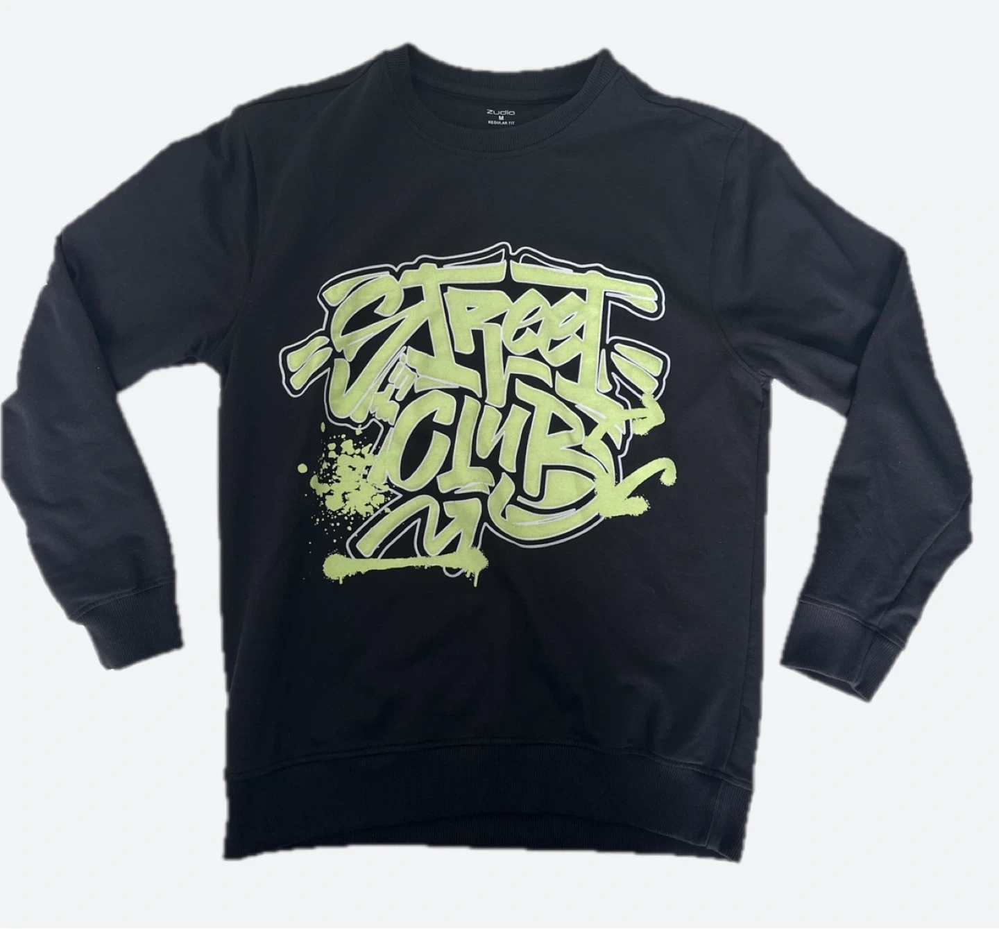 This is a black zudio crewneck sweatshirt with a neon green 'Street Club' graphic. It's a size medium with a regular fit. The sweatshirt is made of a soft, comfortable fabric.