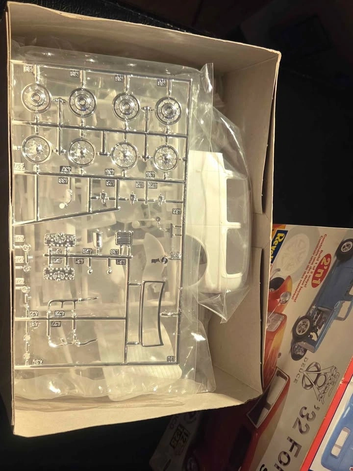 Cool Revell '32 Ford Sedan Street Rod plastic model kit. This one is a 2 in 1 kit so you can build it two different ways! It's 1:25 scale and has 174 parts. Parts are molded in white, transparent red, clear, with chrome pieces and soft black tires. Kit is unassembled and parts are still sealed in bags.