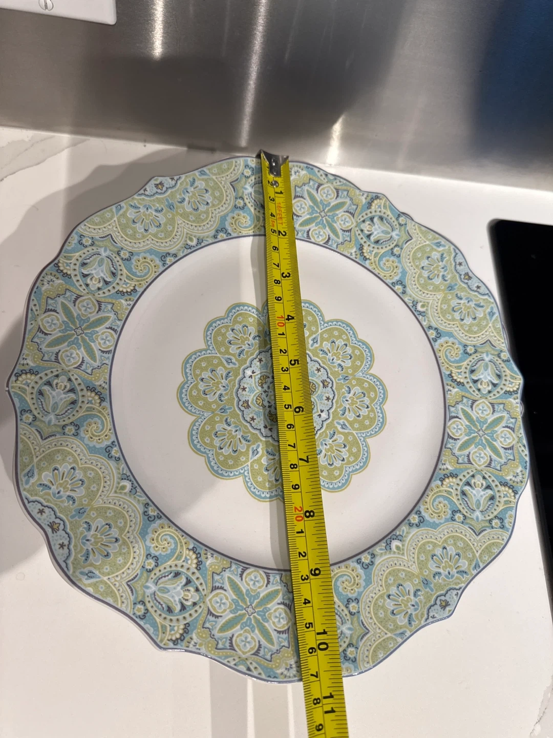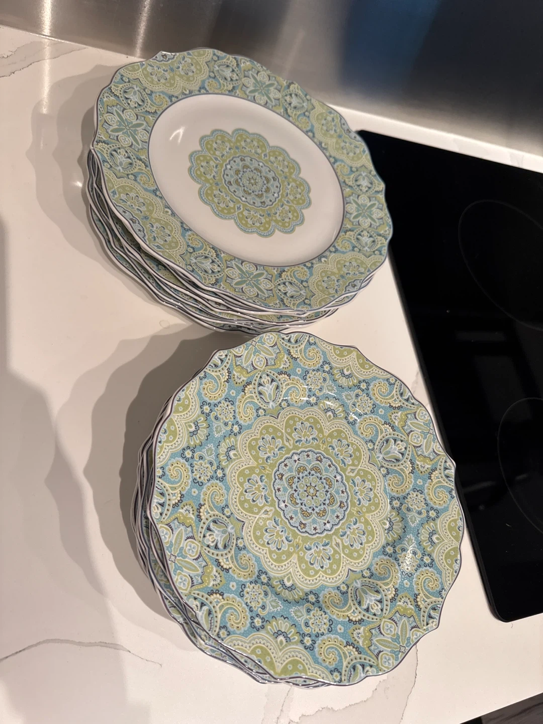 This is a set of 14 decorative plates. They have a vibrant blue, green, and white paisley-inspired pattern. Never used.