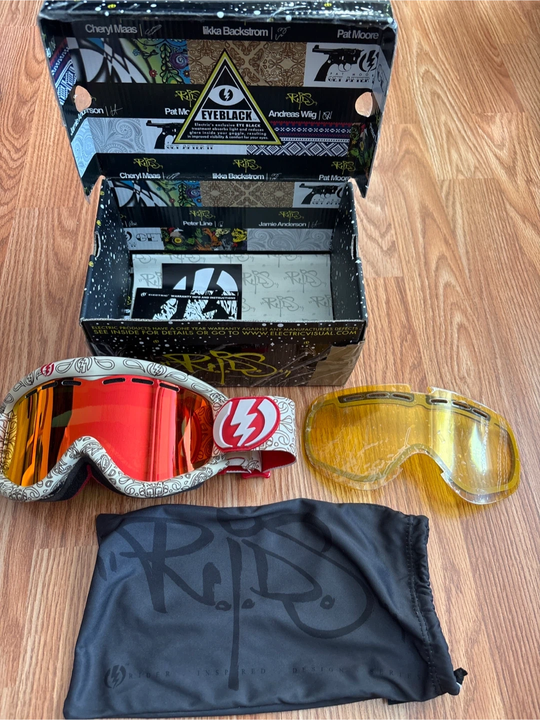 These are Electric EG2 goggles, featuring an Eye Black treatment that absorbs light and reduces glare. It comes with an extra yellow lens and a protective bag. These goggles are great for improving visibility and comfort while skiing or snowboarding.