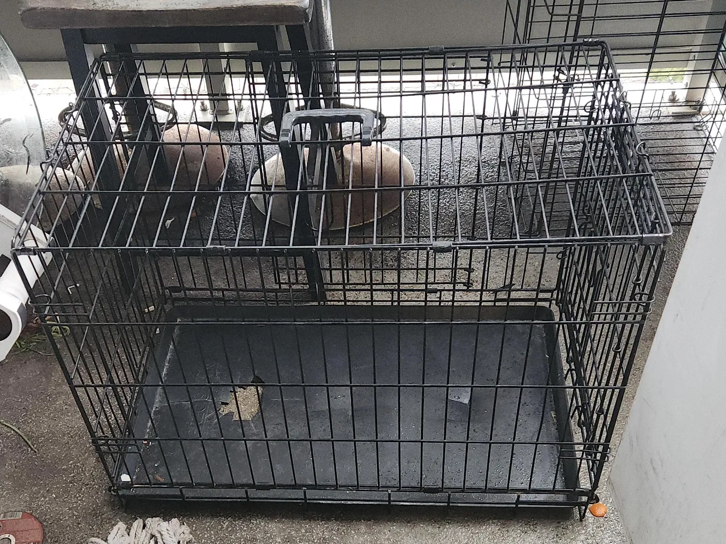This is a black metal dog crate. It includes a removable plastic tray for easy cleaning. It's suitable for small to medium-sized dogs.