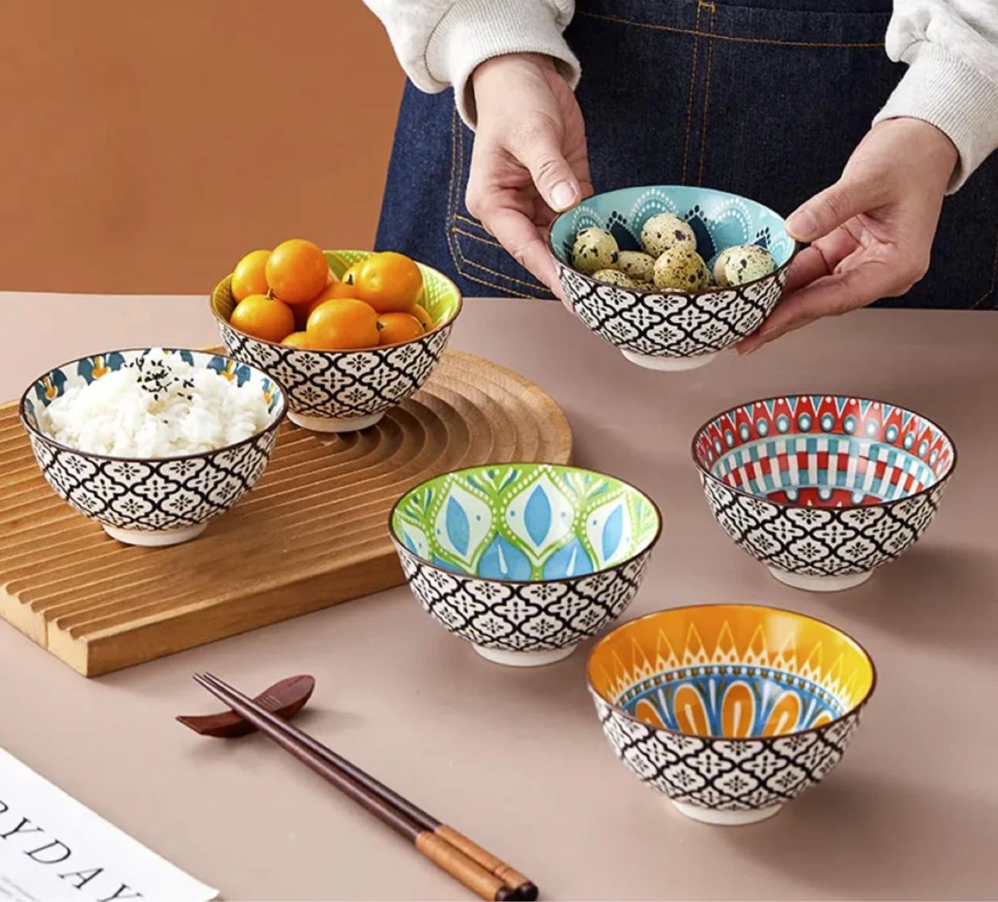 Set of six small ceramic bowls, each with a unique colourful pattern. They're perfect for serving rice, snacks, or small appetizers. Made of durable ceramic material.