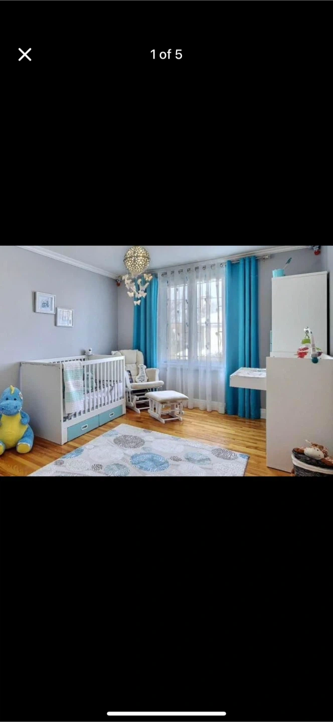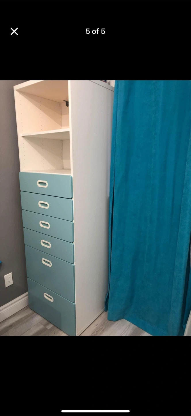 Selling a crib and changing table and wardrobe combo. It's in great condition and perfect for a nursery! The crib has a white frame with a blue drawer section, and the changing table and wardrobe have a white top with matching blue drawers and shelves. Ready for a new home!