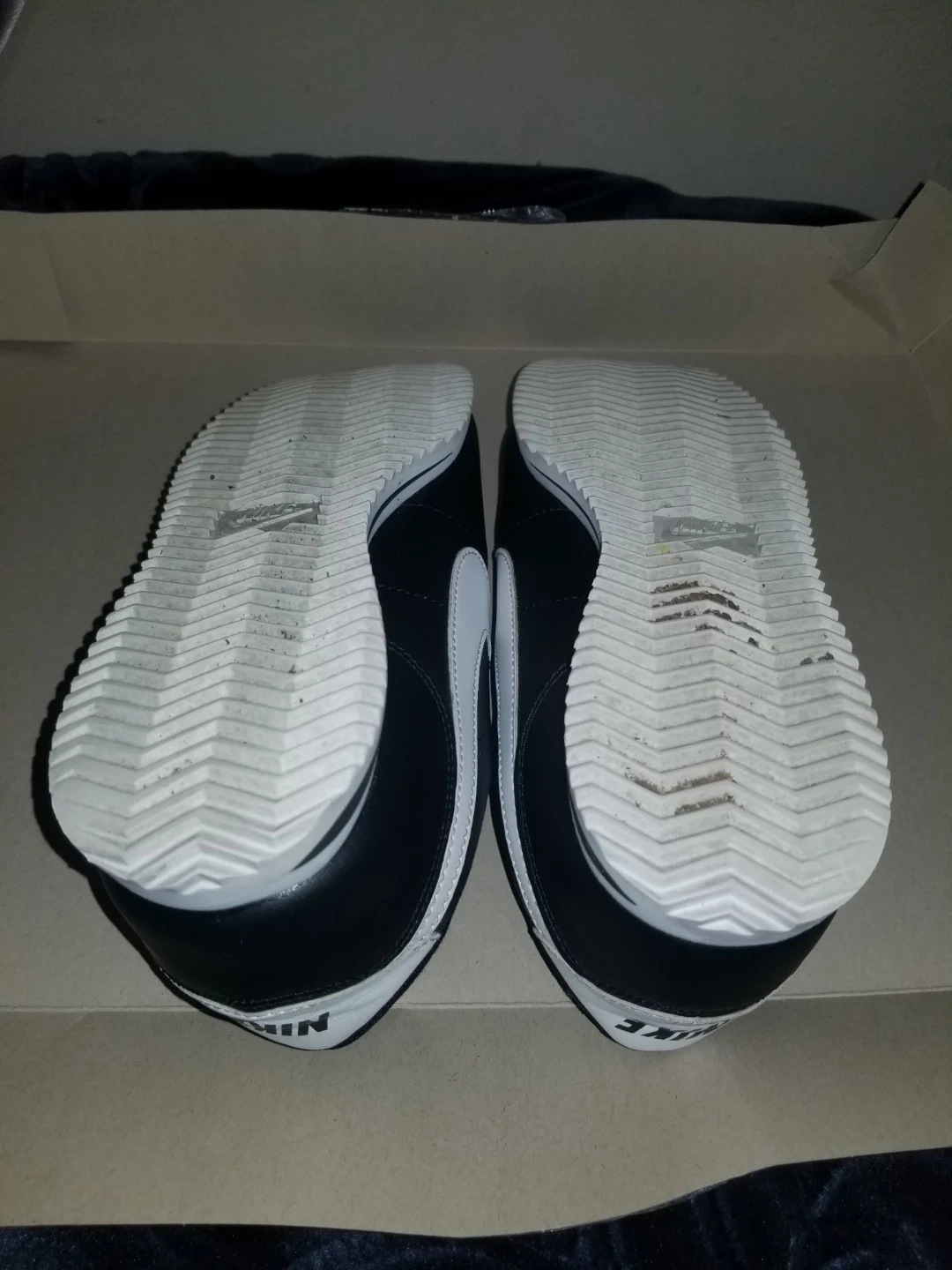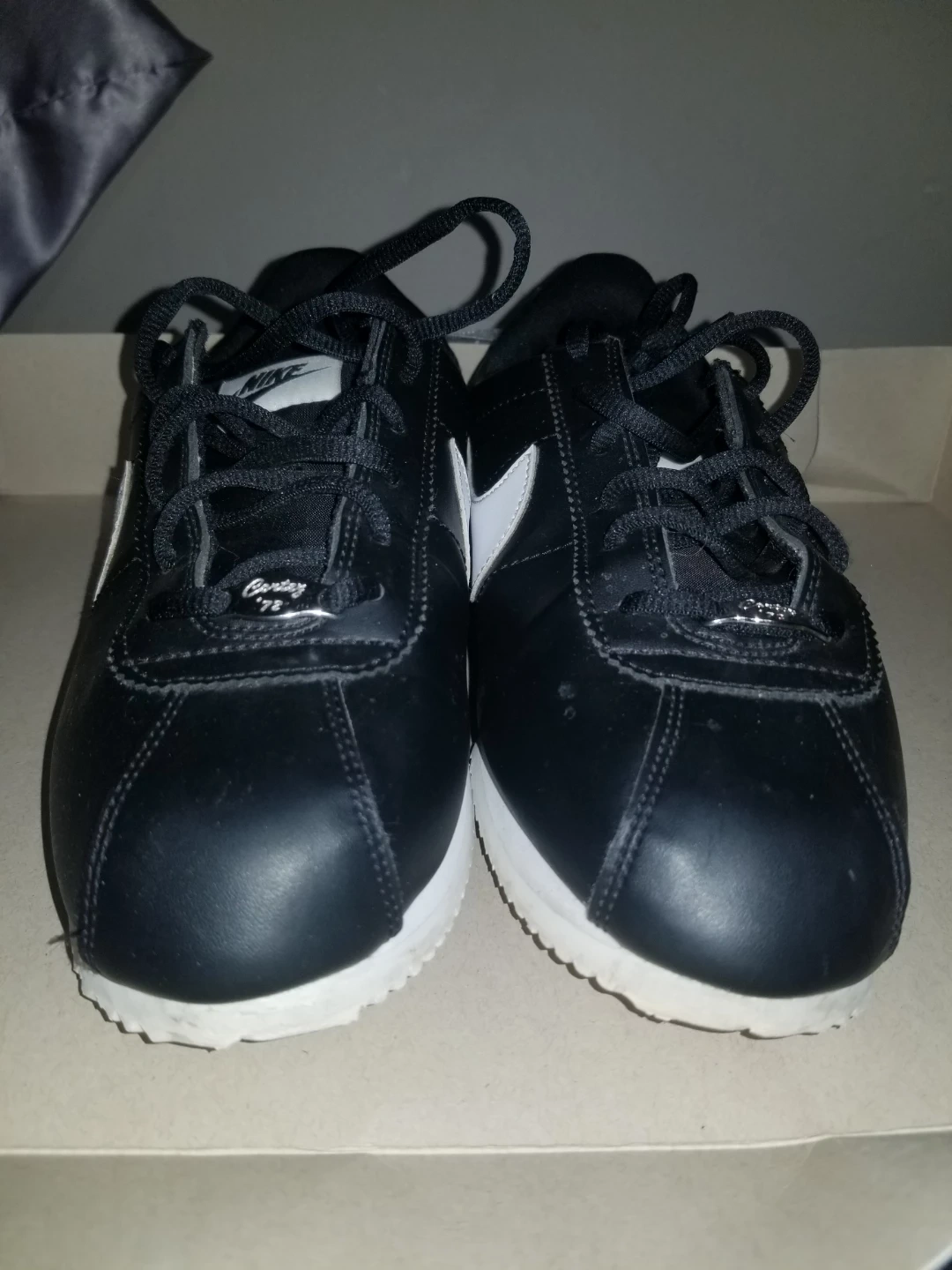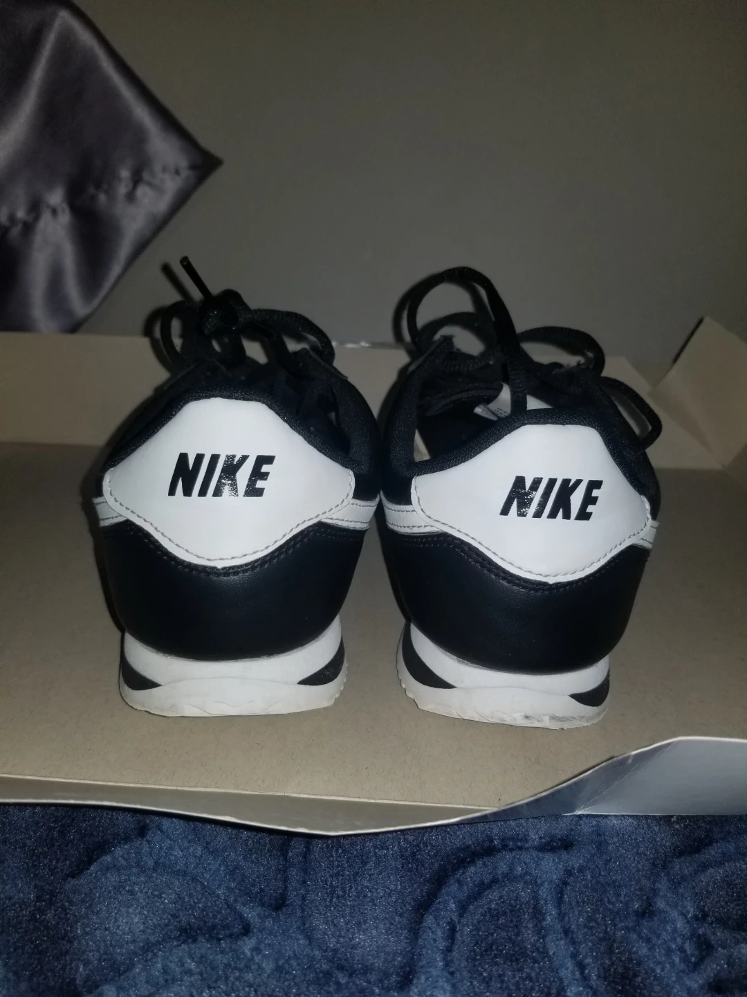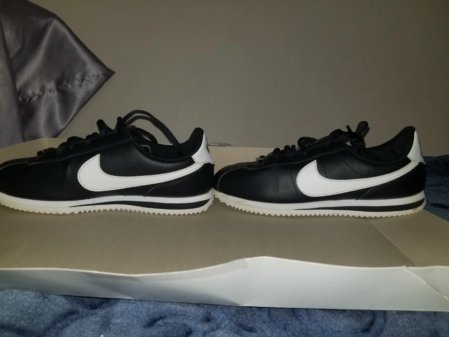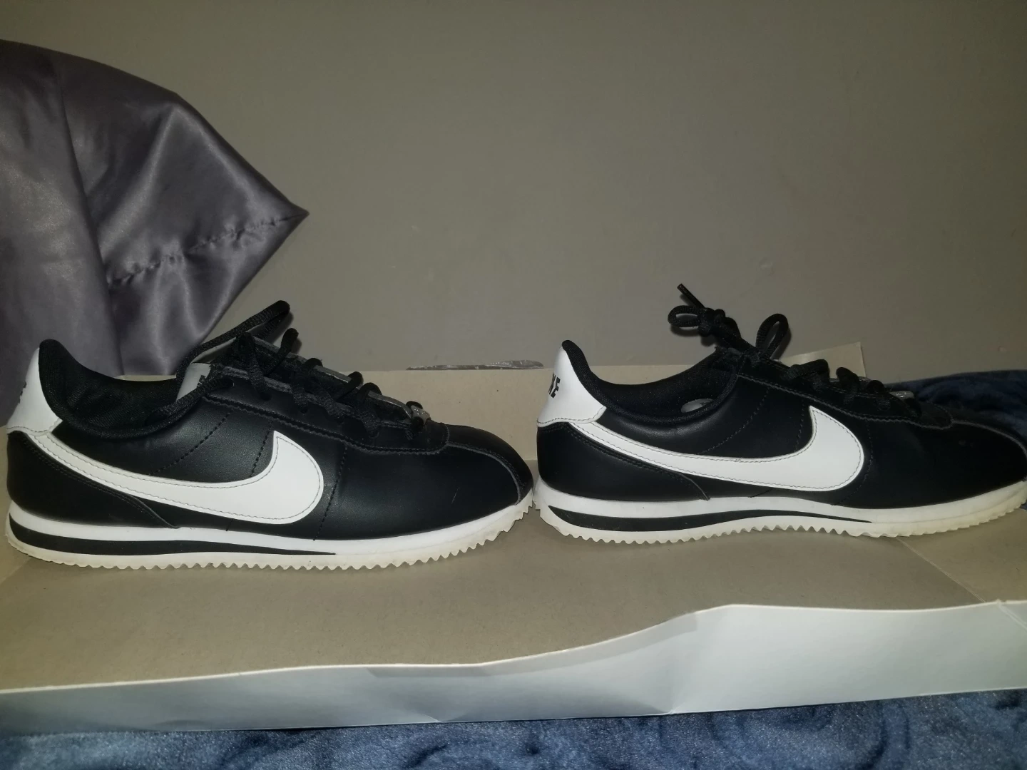 Selling a pair of Nike Cortez Basic Leather shoes in black and white. They show some signs of wear on the soles, but the uppers are still in good condition. Great for casual wear or workouts! SIZE 7 GS Boys