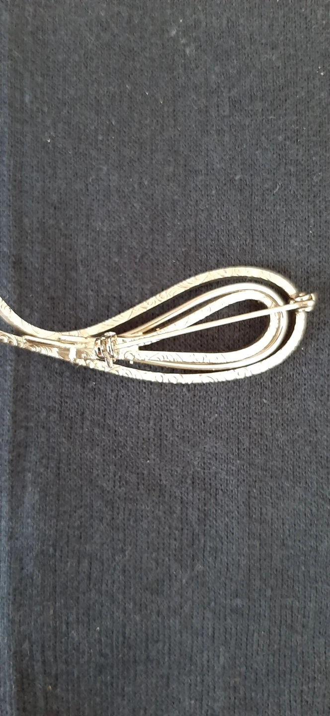 silver tone brooch with intricate scroll design & pearl.