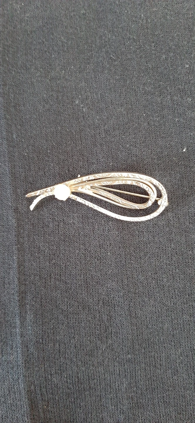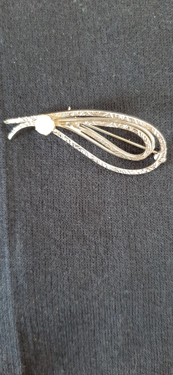 silver tone brooch with intricate scroll design & pearl.