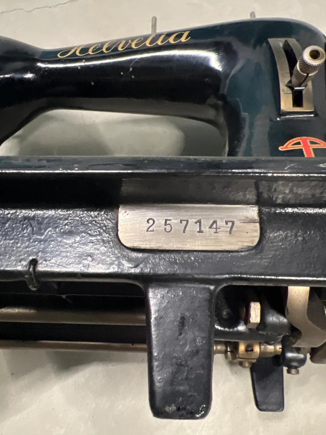 This is a heavy-duty, cast-iron Helvetia head manufactured by Schweiz. Nähmaschinen-Fabrik AG in Luzern. Features original gold decals and the iconic Swiss "Crossbow" logo.
