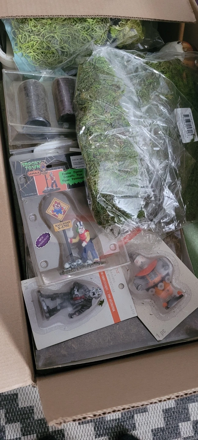 This lot includes Lemax Spooky Town figurines and craft moss for decorating. Items include a clown figurine at a railroad crossing and a zombie-style figurine. Perfect for model builders and crafters looking to add detail to their projects!