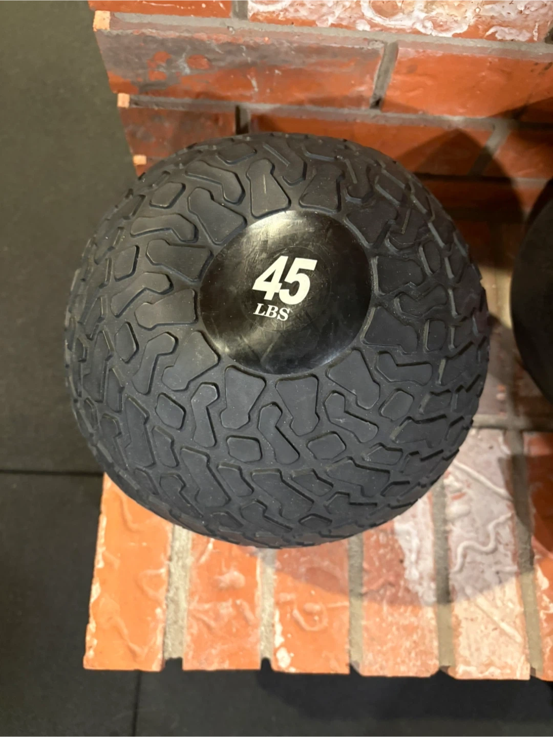 This is a 45 lb slam ball. It's made of durable rubber with a textured surface for grip. Perfect for intense full-body workouts!