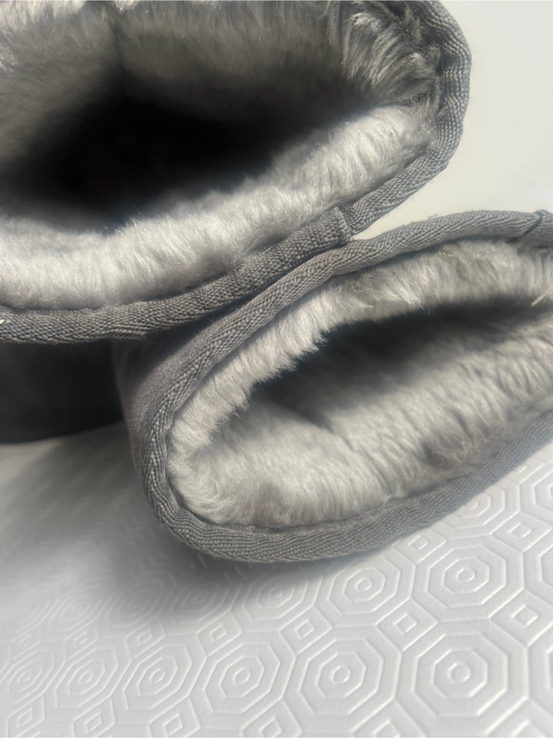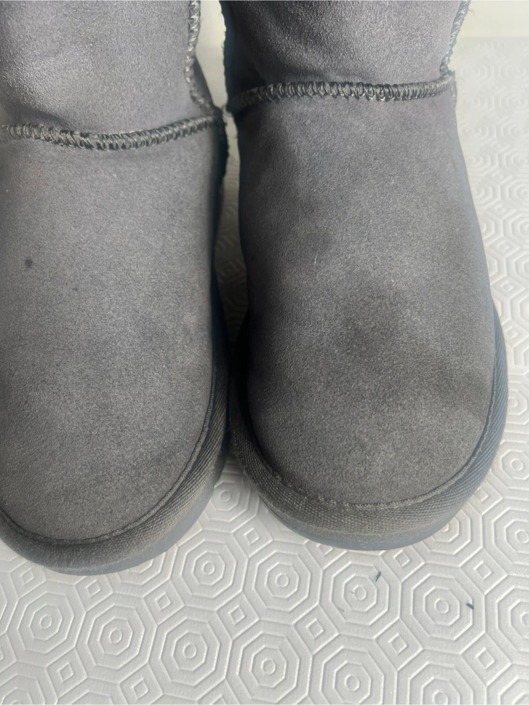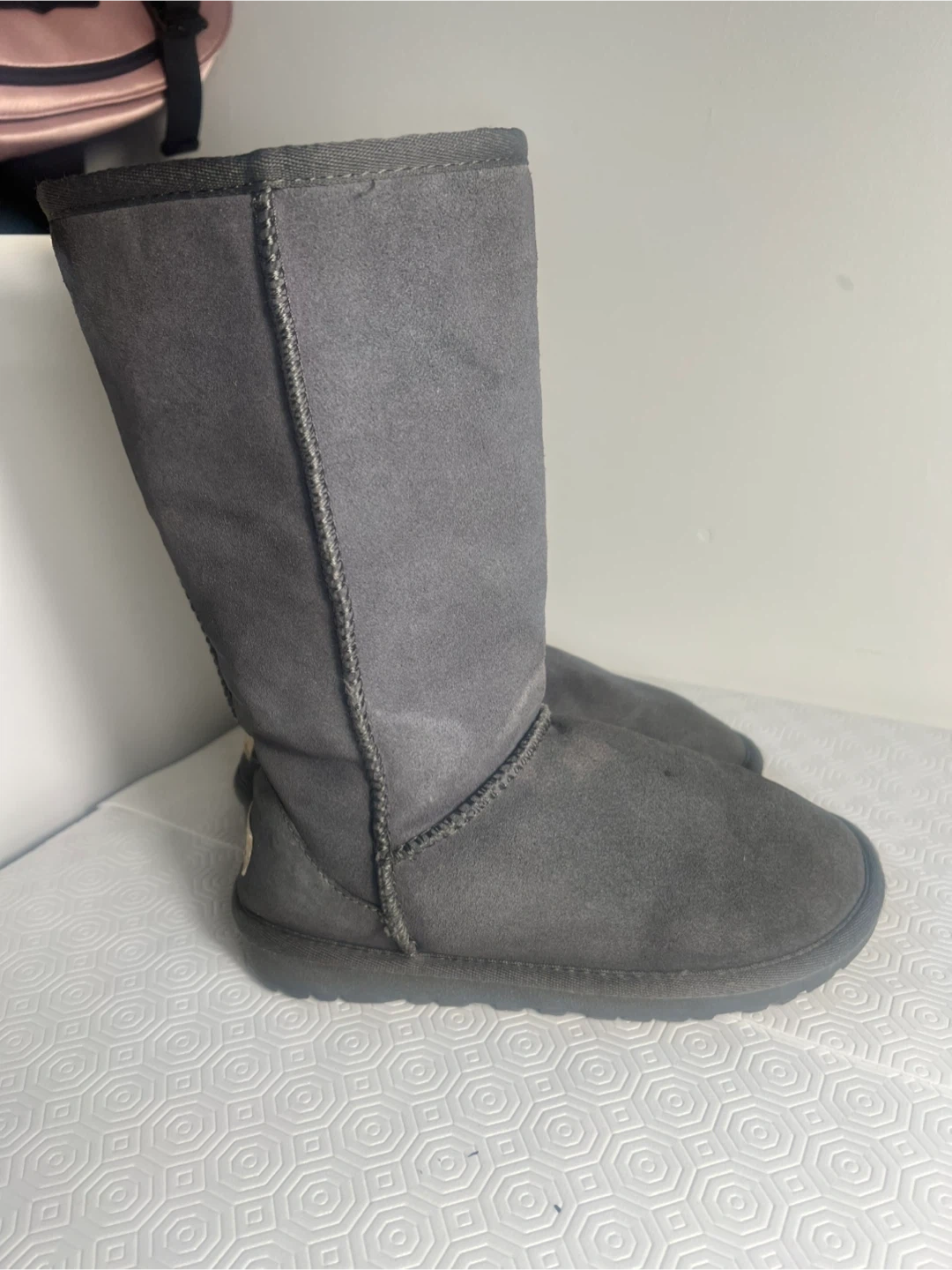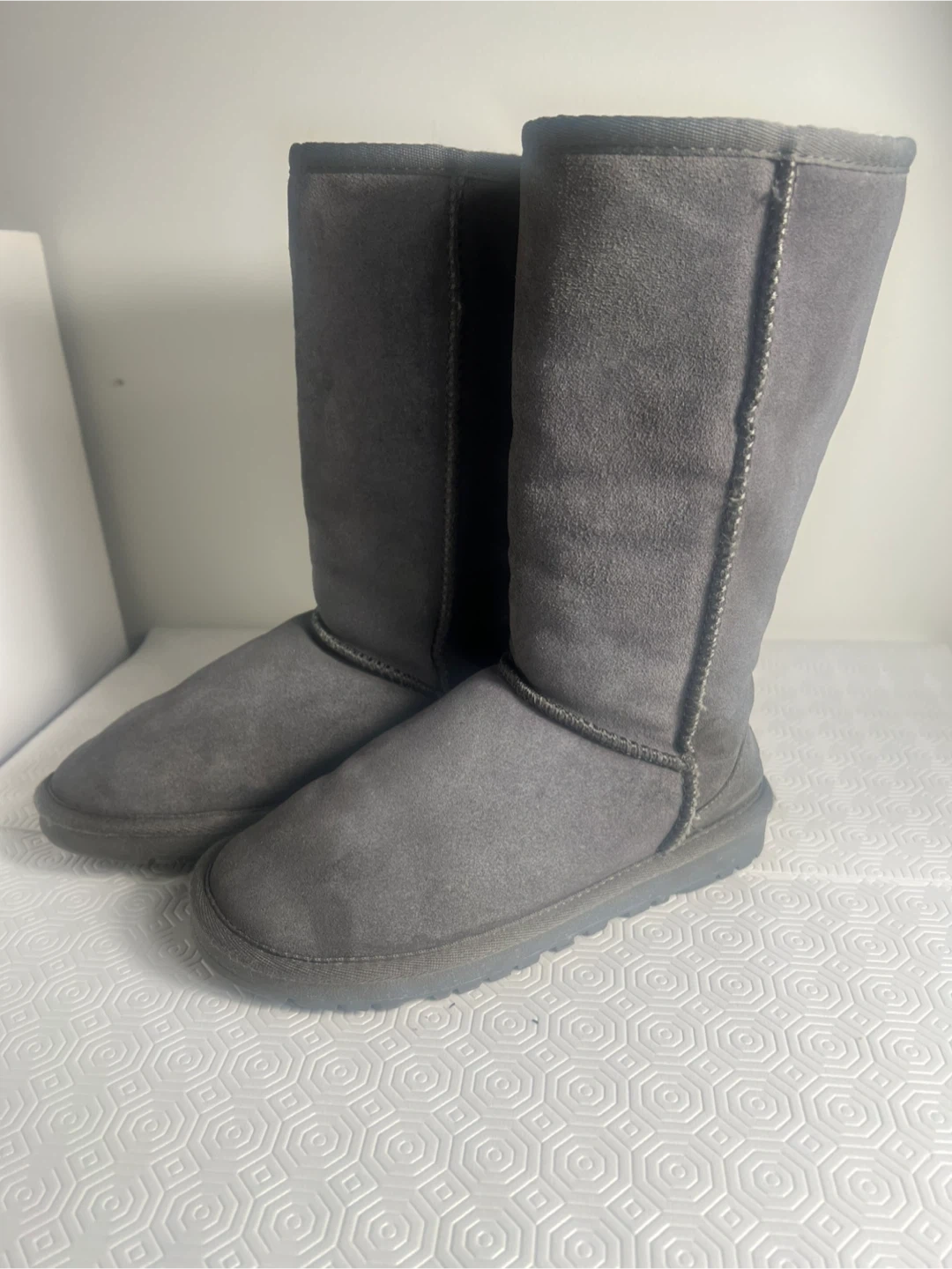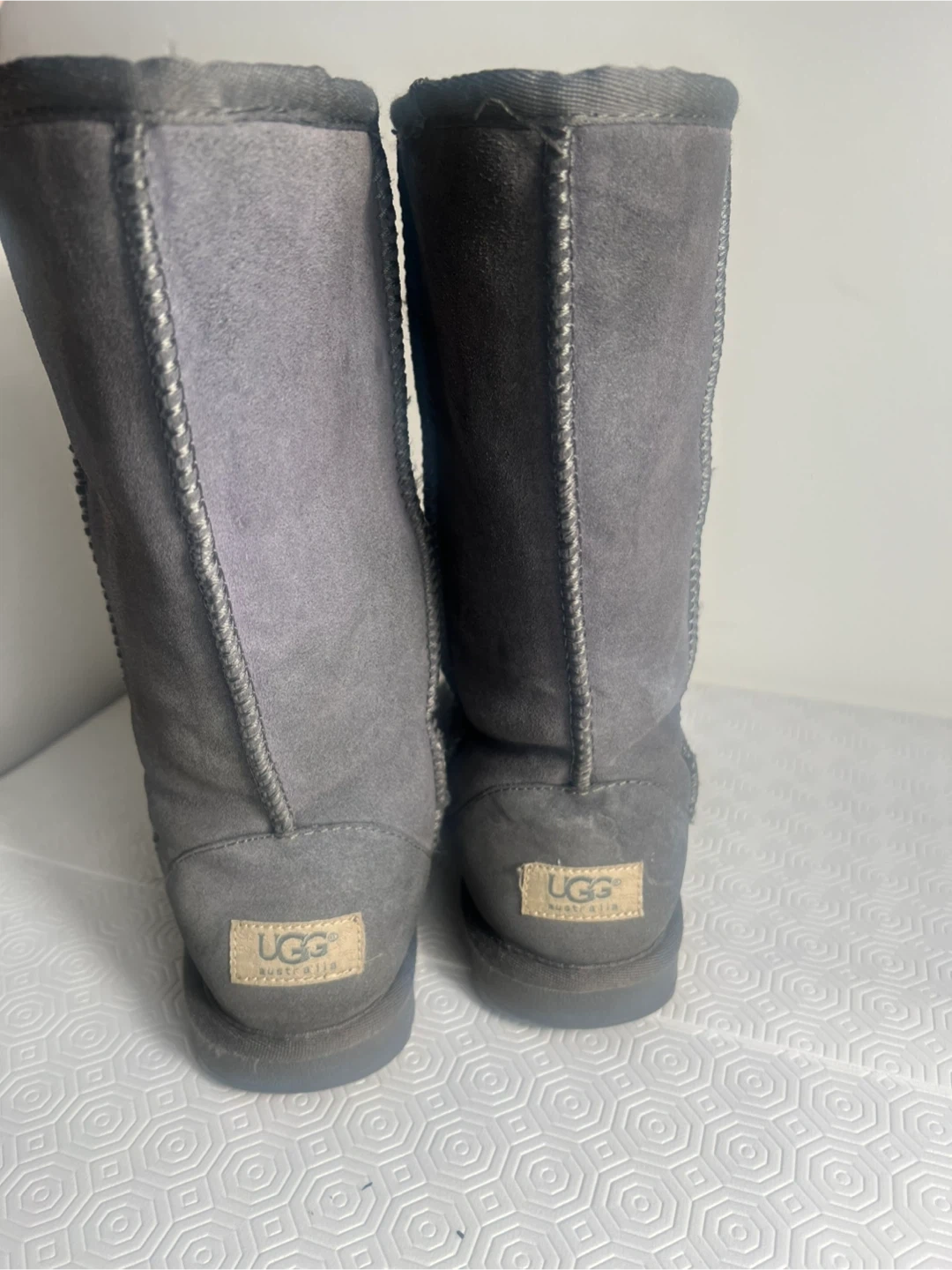 UGG Australia tall boots in a classic grey shade. These cozy boots feature a soft suede exterior and a warm, fuzzy lining inside. They're perfect for keeping your feet warm on chilly days!