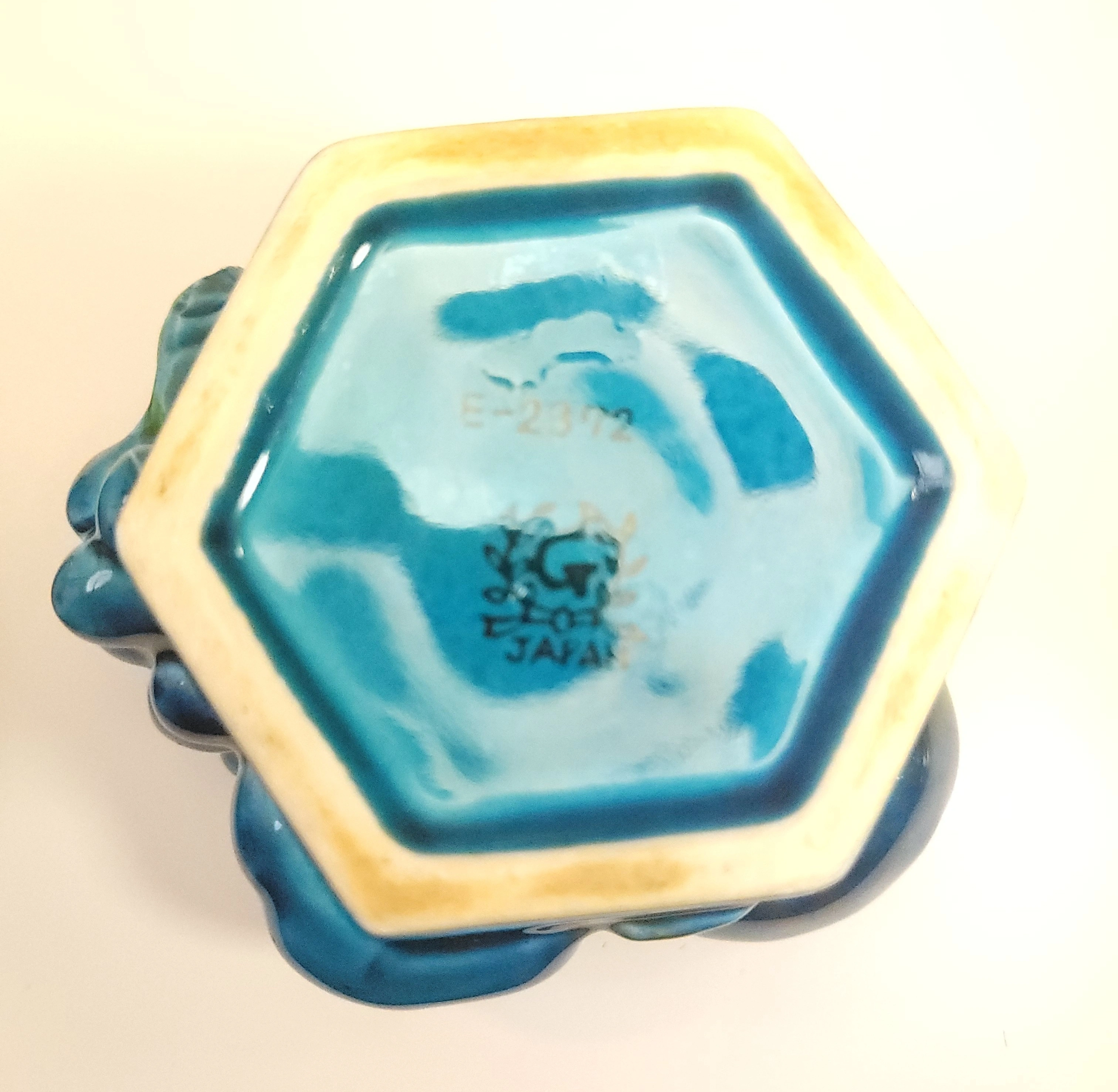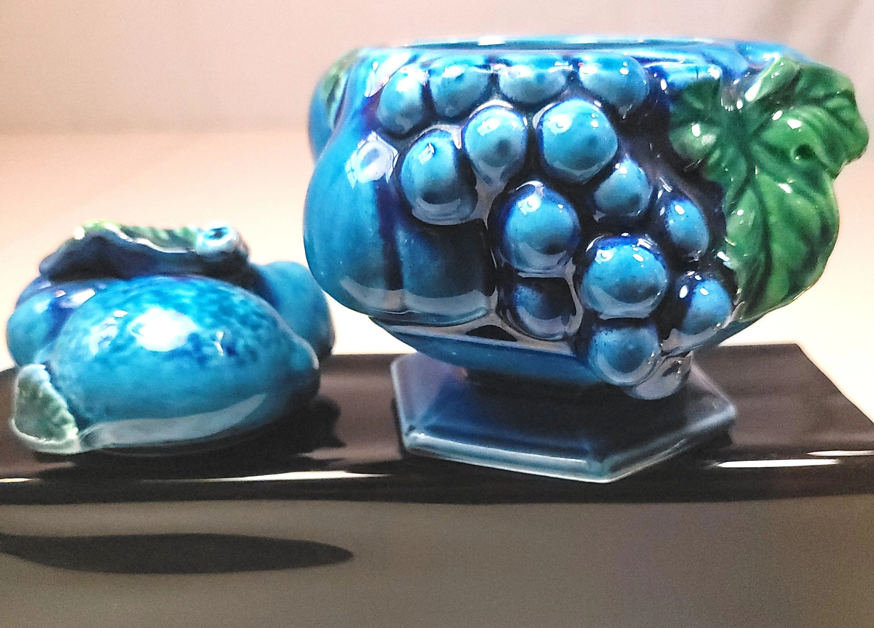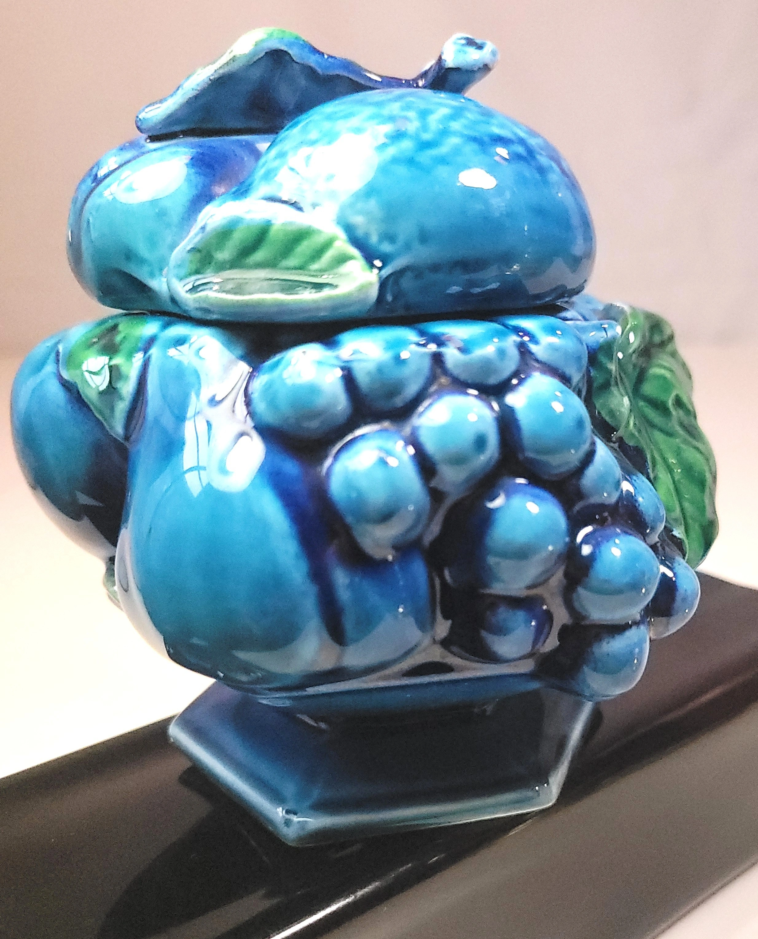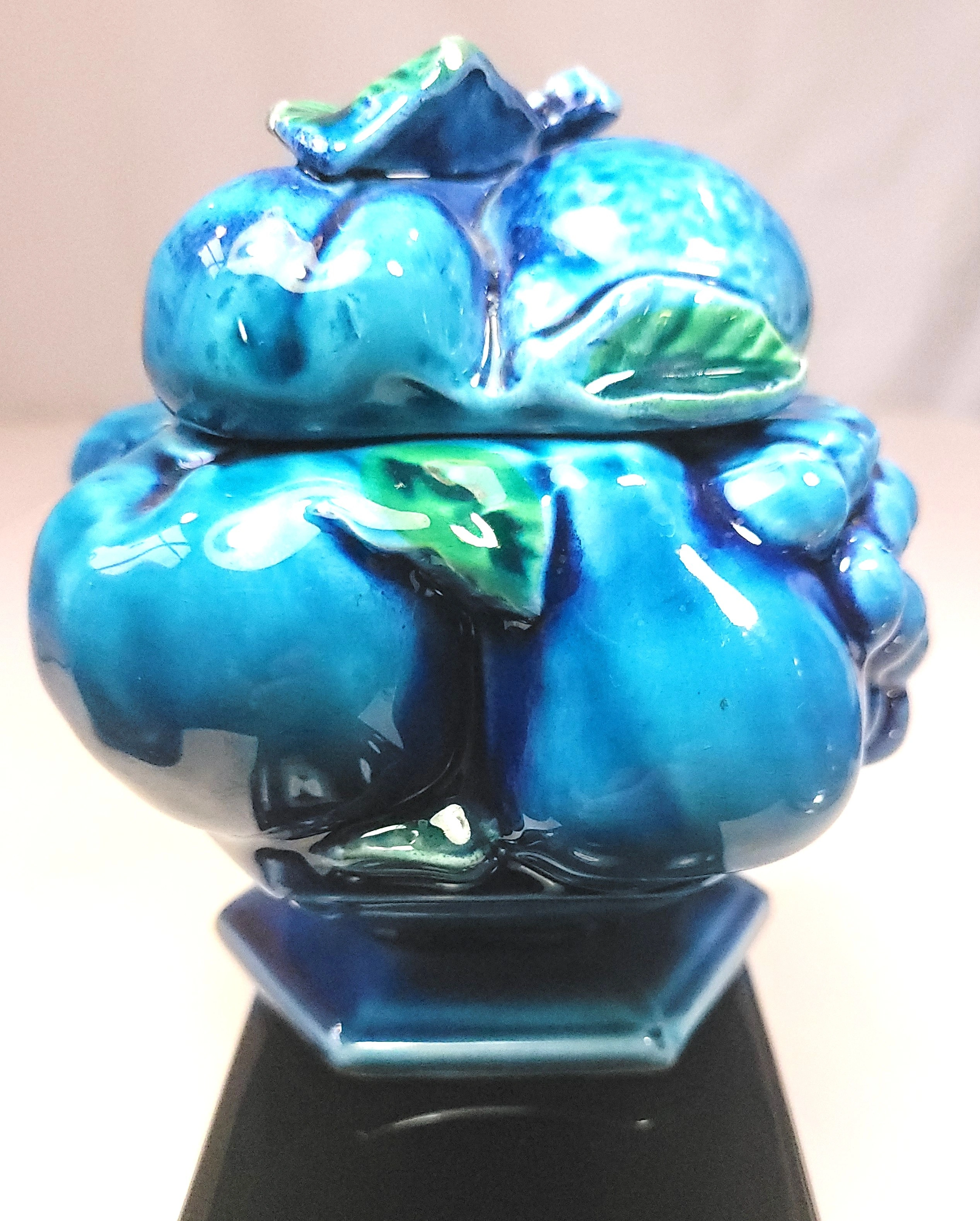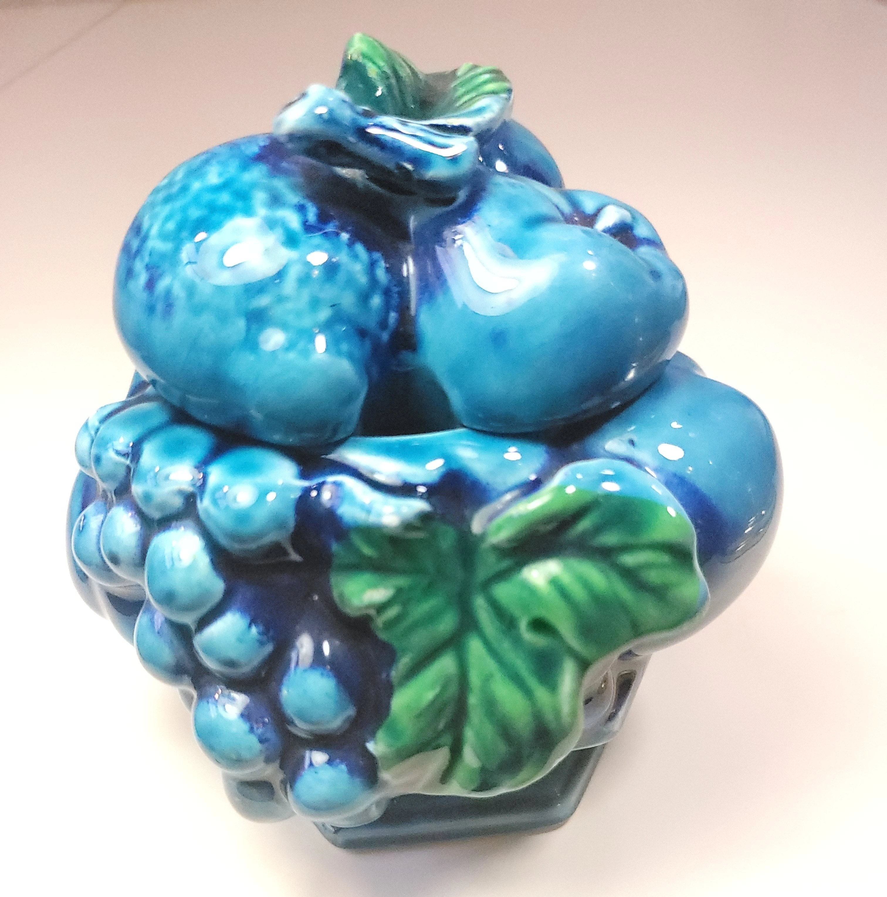 Authentic mid-century modern lidded jar from the highly collectible Inarco "Mood Indigo" line. Produced in Japan in 1968, this piece features the iconic deep blue glaze and 3D embossed fruit and leaf motif. A quintessential piece for collectors of mid-century Japanese pottery and kitchen kitsch.