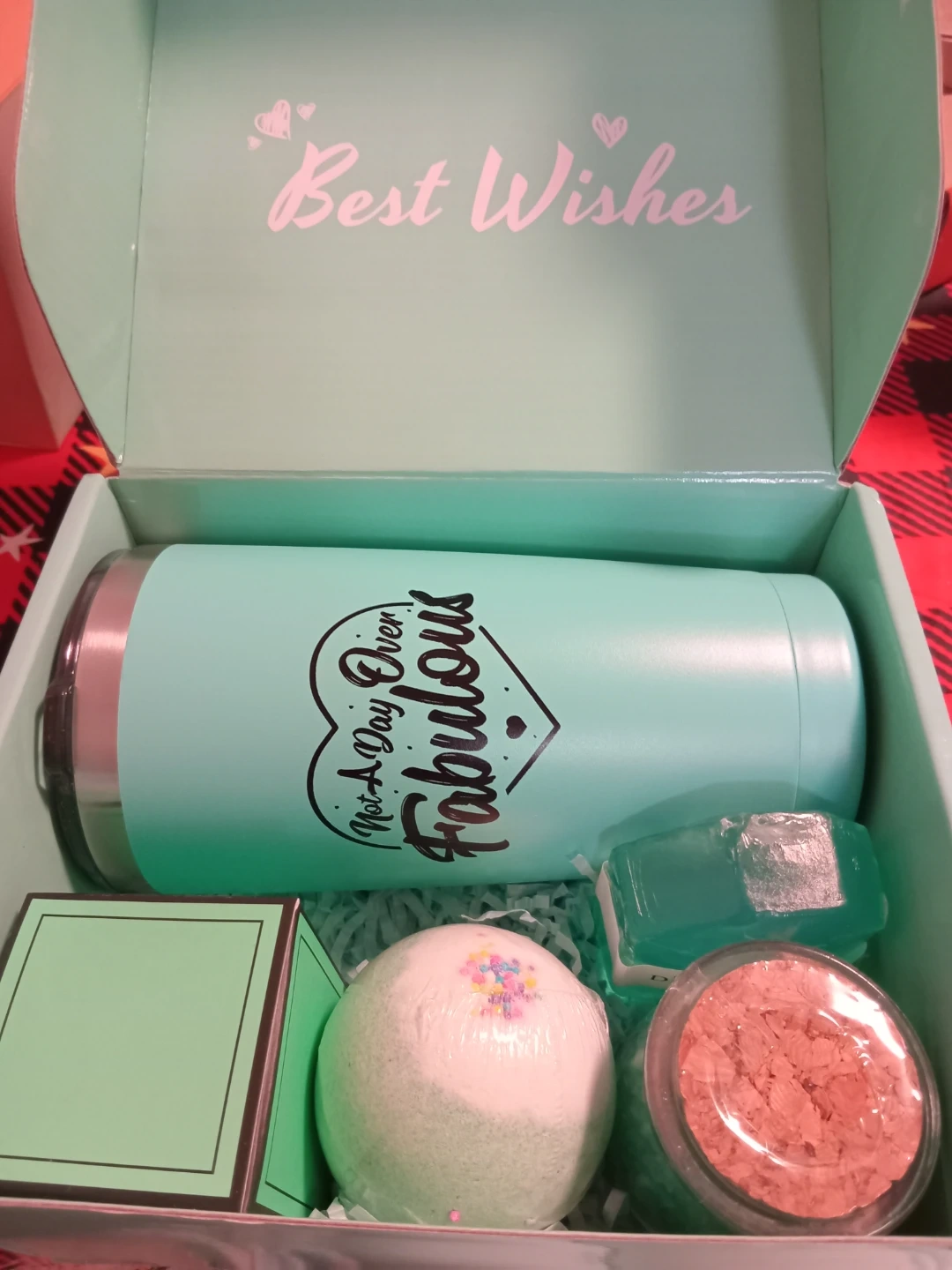 Selling a cute gift box with 'Best Wishes' on the inside! It includes a tumbler with 'Not a Day Over Fabulous' printed on it, a bath bomb, a bar of soap, and a jar of something that looks like bath salts. Perfect for a little treat or a thoughtful gift