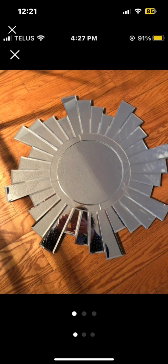 Decorative sunburst mirror. Features segmented mirror pieces radiating from a central mirrored circle. This mirror adds a touch of sparkle to any room! It's a statement piece for your wall.