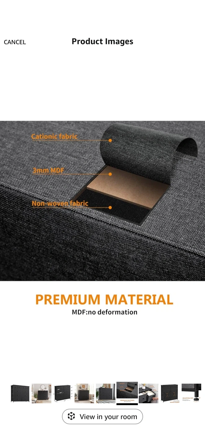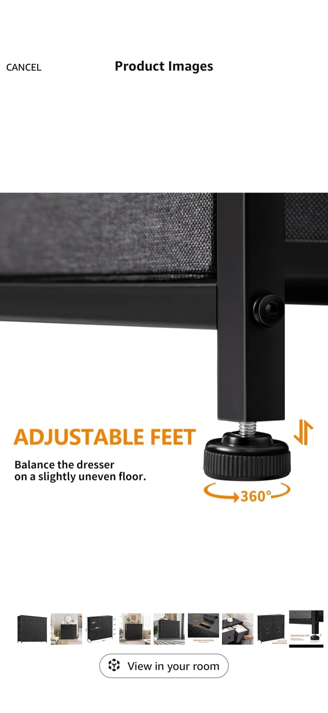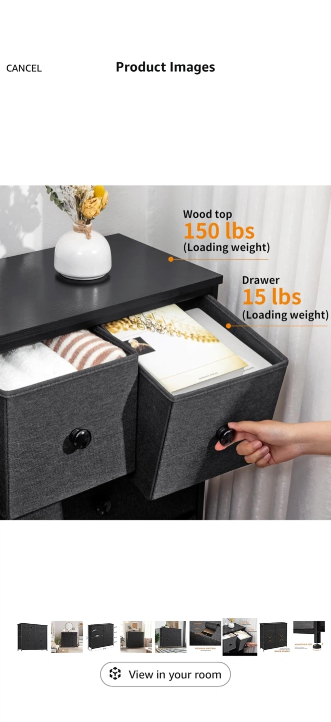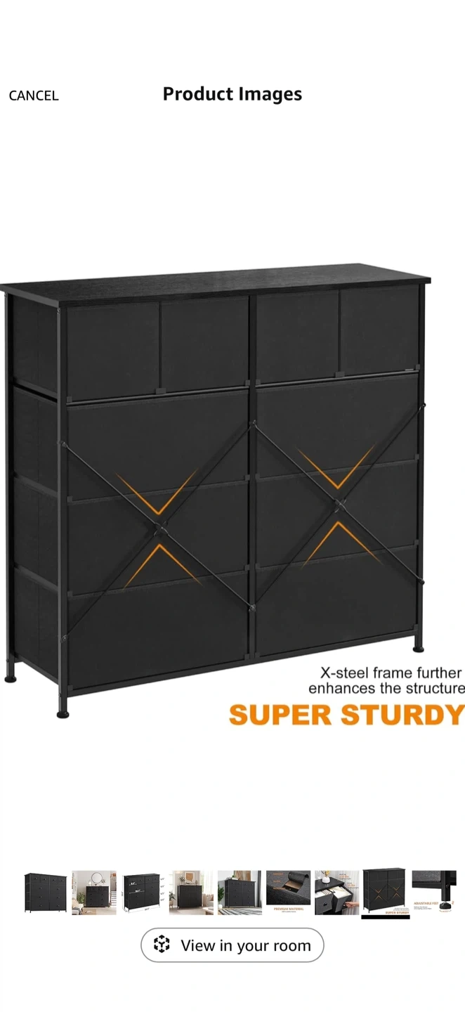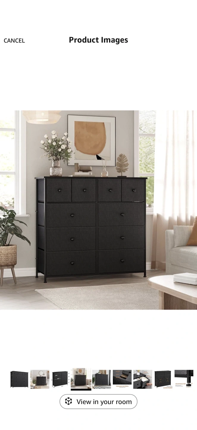 This fabric dresser offers ample storage with 10 drawers. Its metal frame and fabric drawers provide durability. Dimensions are 39.4" W x 11.8" D x 38.6" H. Great for organizing clothes and accessories!
