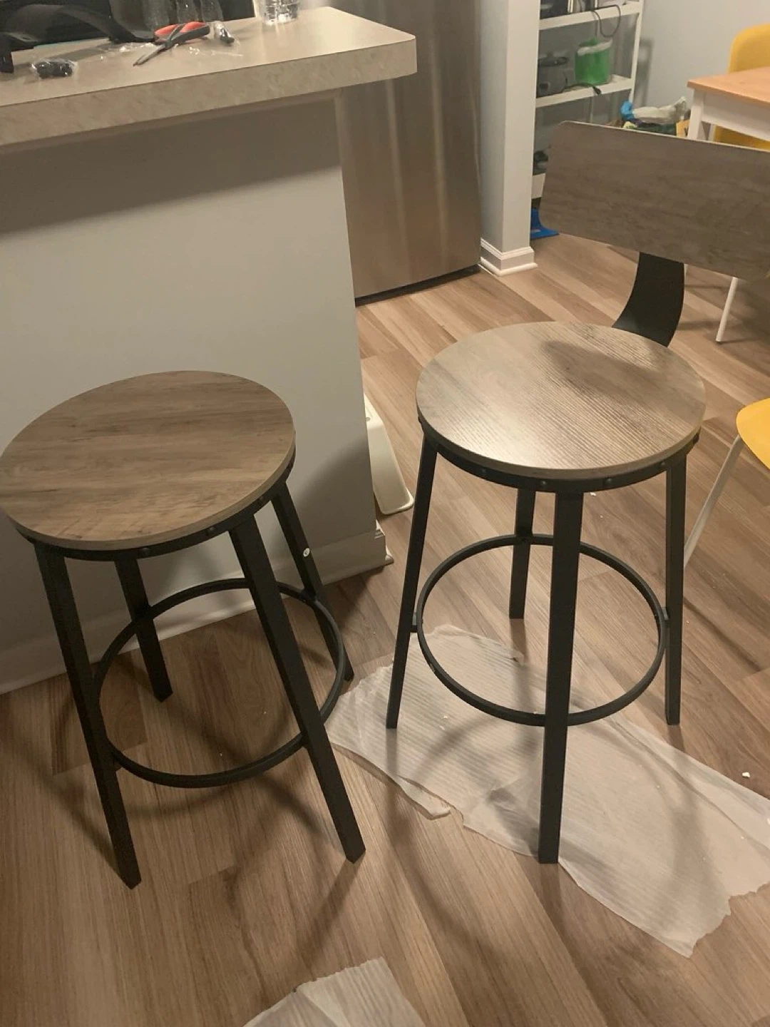 Set of two counter height bar stools. Each stool features a round wooden seat, backrest, and a metal frame with a footrest. Available for pick up in Downtown Jersey City.