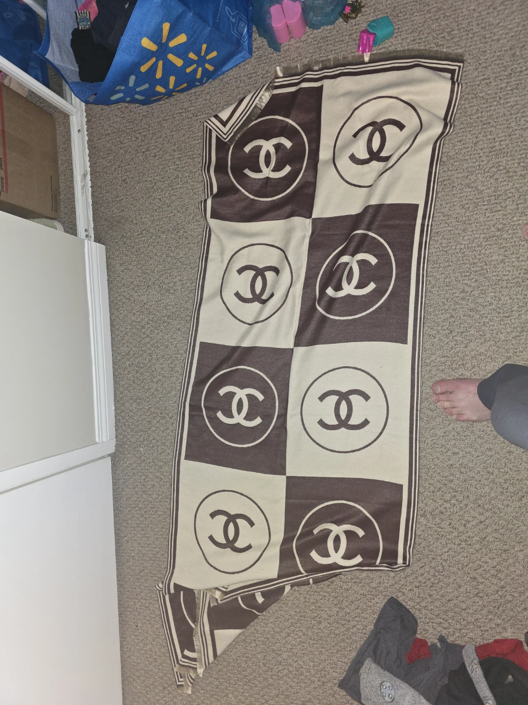 Selling a Chanel scarf in a lovely brown and white colour scheme. It features the iconic Chanel logo pattern throughout. Perfect for adding a touch of elegance to any outfit!
