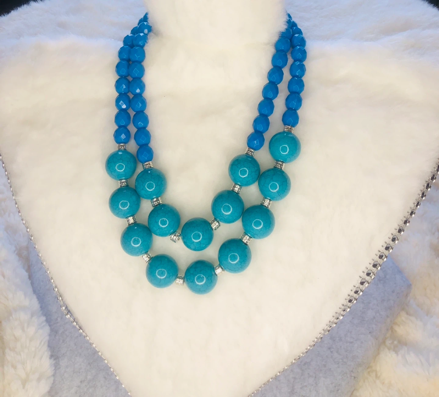 This two-strand beaded necklace features large faux turquoise-colored beads and smaller faceted blue beads. It comes with matching stud earrings. Adjustable clasp closure.