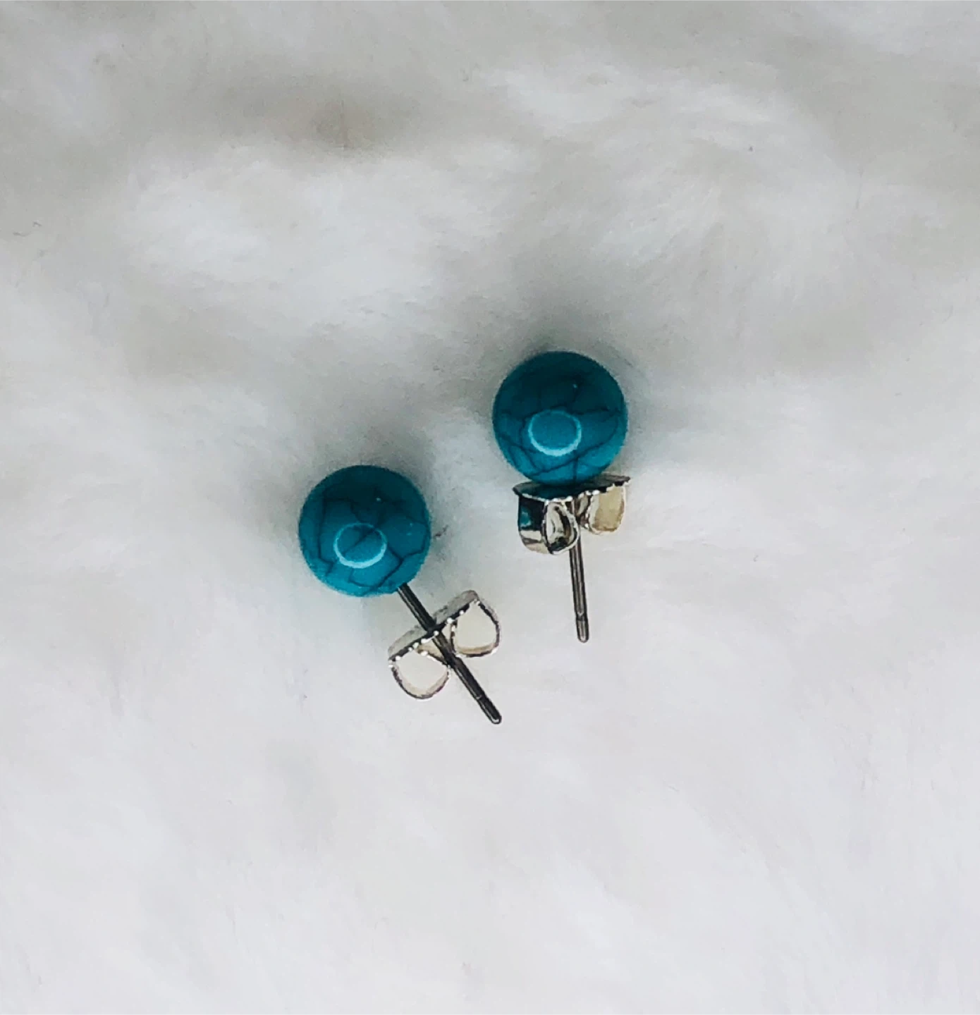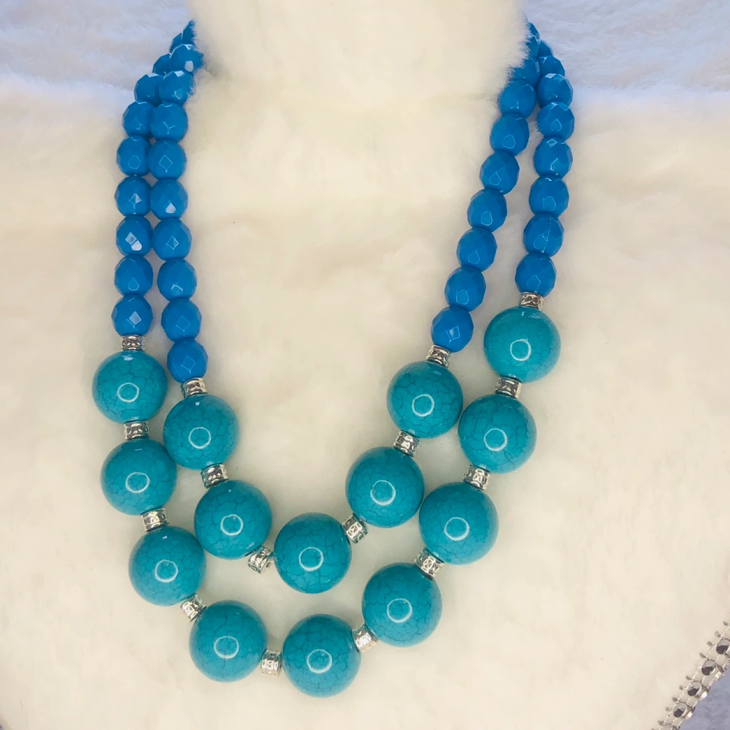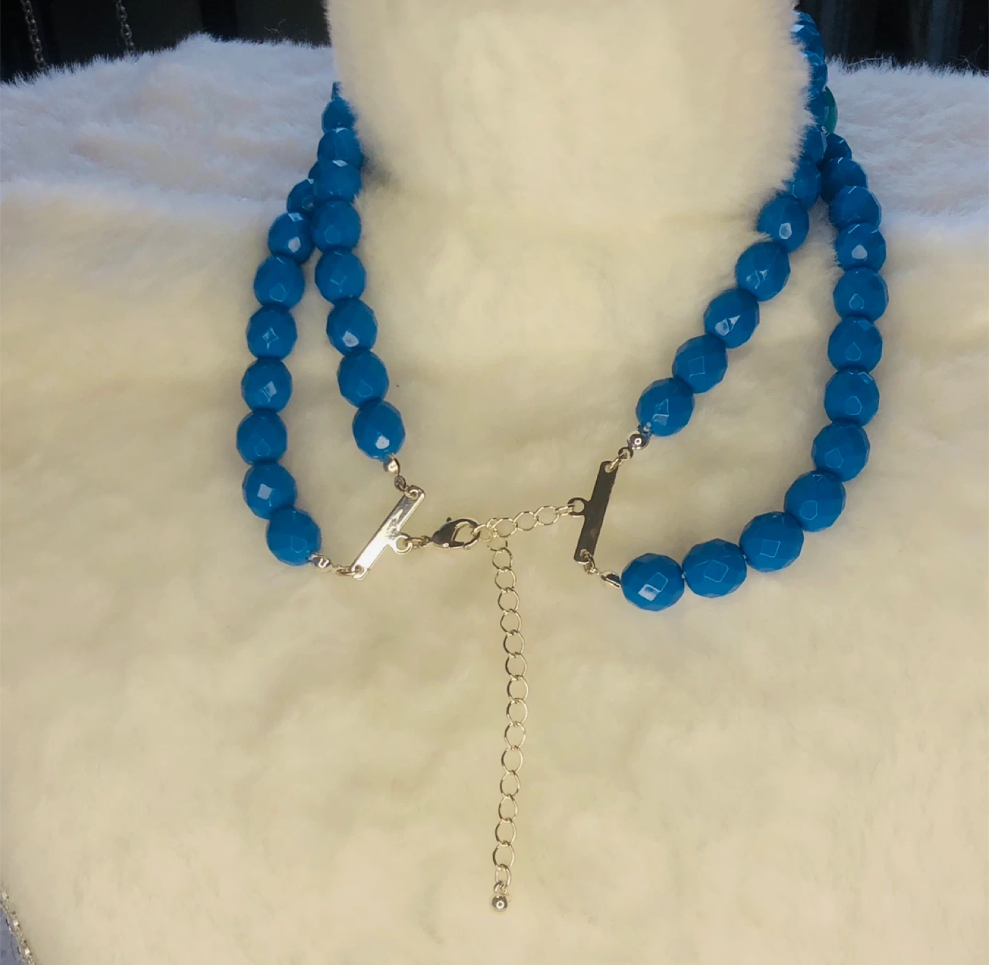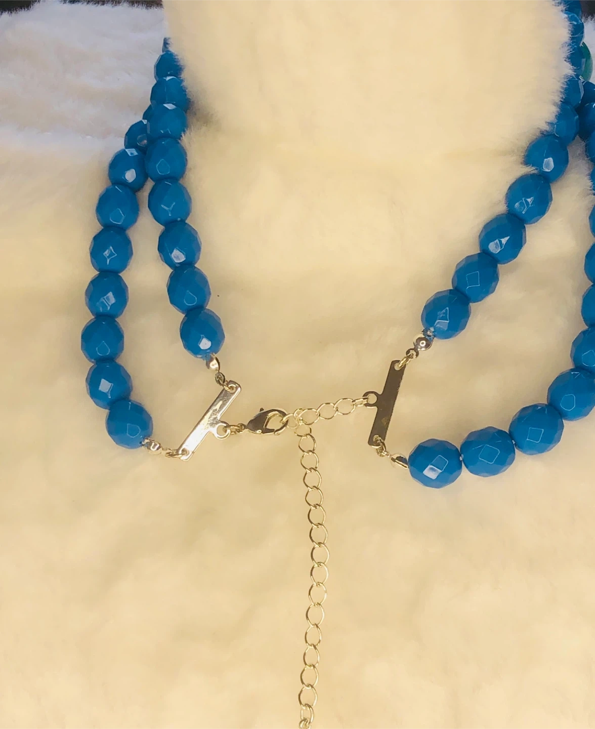This two-strand beaded necklace features large faux turquoise-colored beads and smaller faceted blue beads. It comes with matching stud earrings. Adjustable clasp closure.