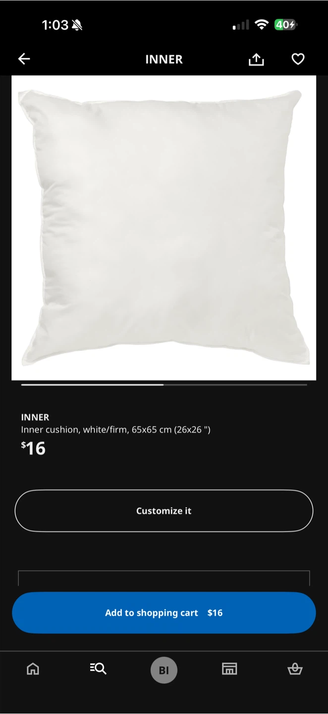 1 / 21 / 2Buy & Sell(2!) IKEA INNER Cushion - 26x26 inch(2!) IKEA INNER Cushion - 26x26 inch$30Selling 2 white IKEA INNER cushion. cushion, sized at 65x65 cm (26x26 inches). Originally bought for $16ConditionLike newWHERE TO MEETCheck LocationView MapSELLERverifiedBeblineCascade Heights802 reviews0 chatsΒ·0 favoritesΒ·3 viewsSEND CHAT TO SELLERHi Bebline! Iβm interested in your listing.Hi Bebline! Iβm interested in your listing.Get the Karrot app to chatSign In to chat