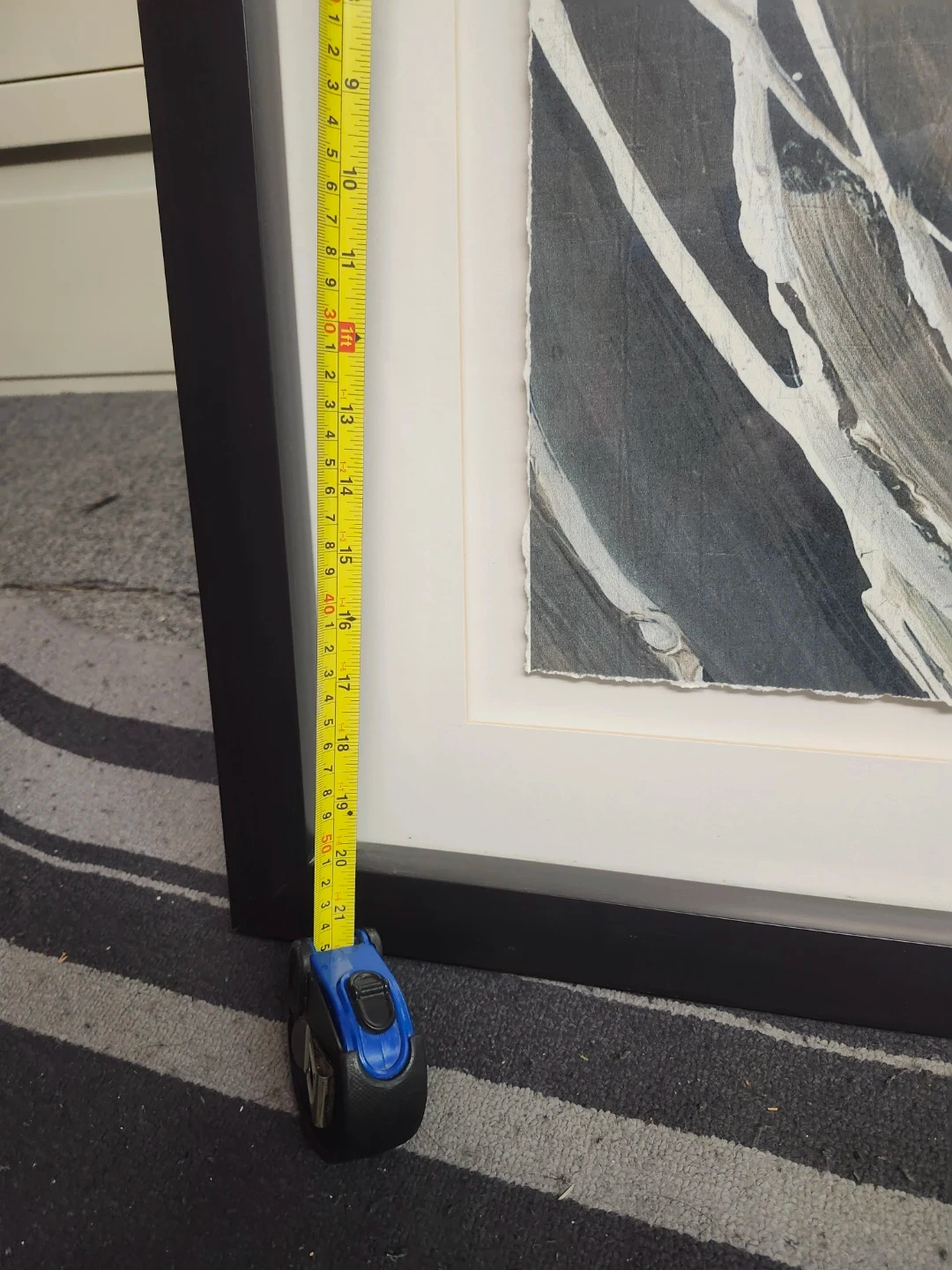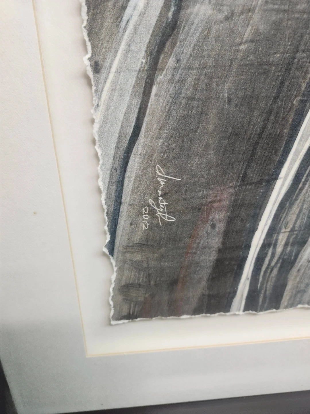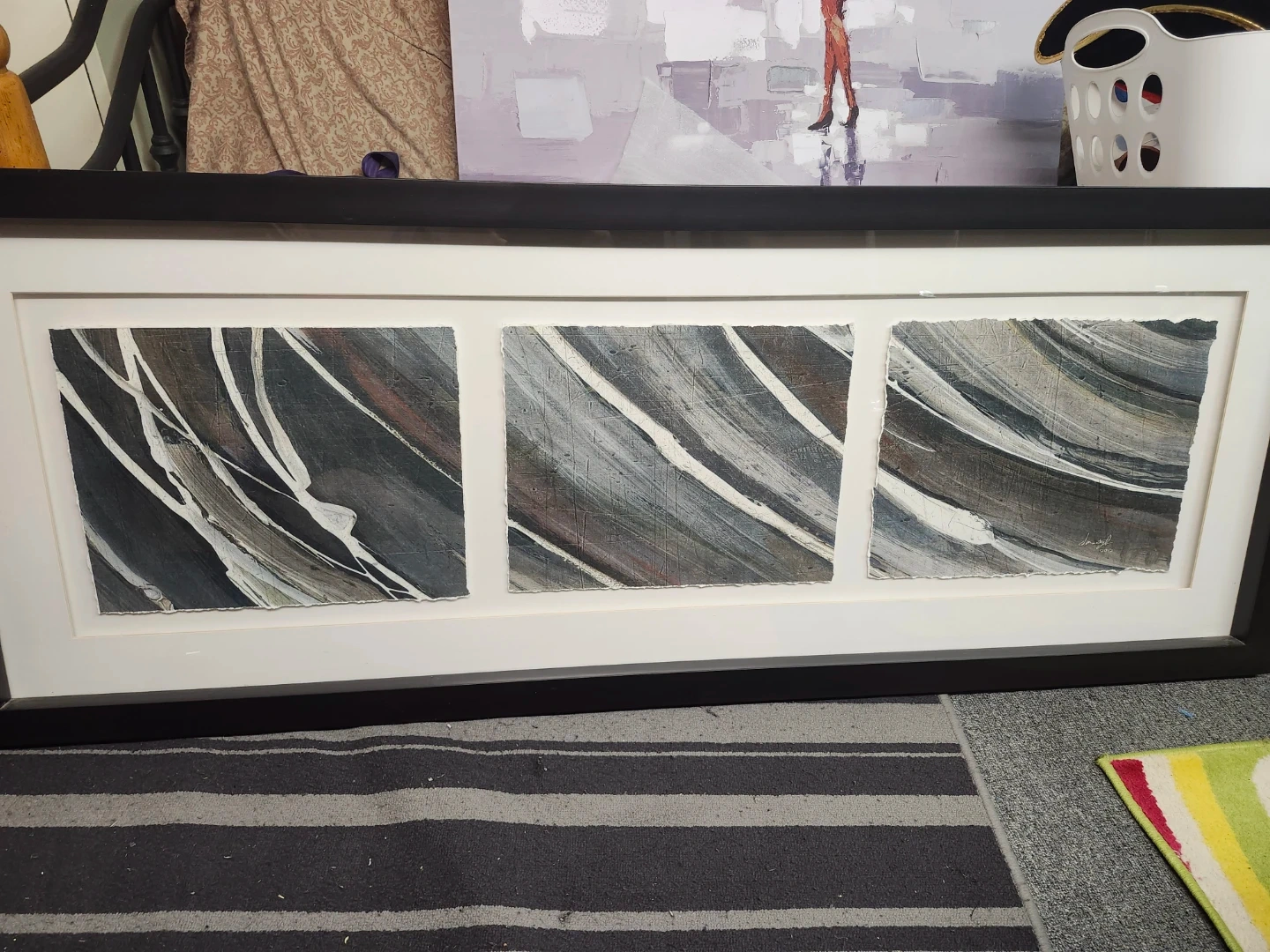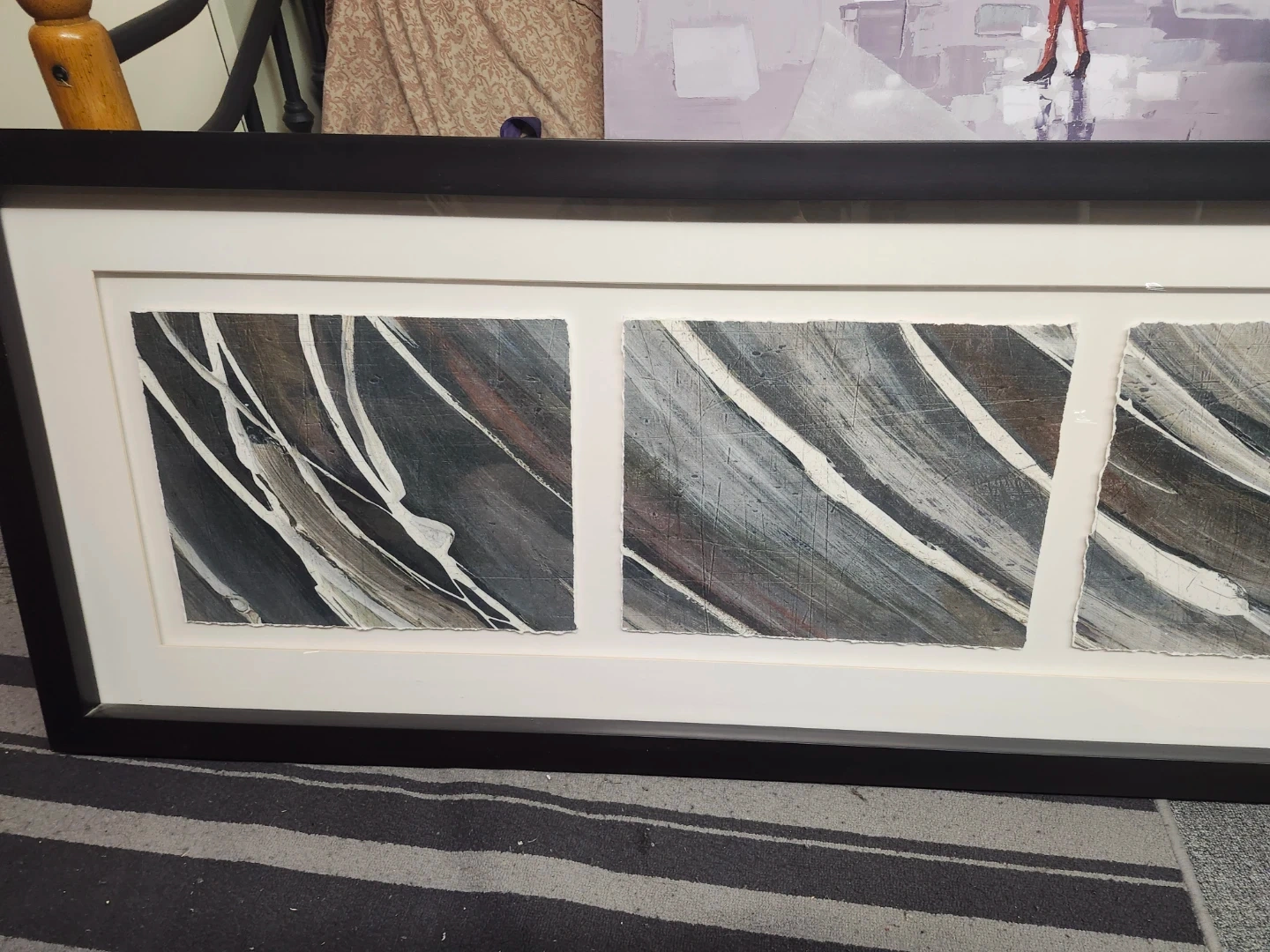Framed abstract art featuring three panels with a distressed paper edge. It's encased in a black frame with a white matting. This piece would add a modern touch to any room!