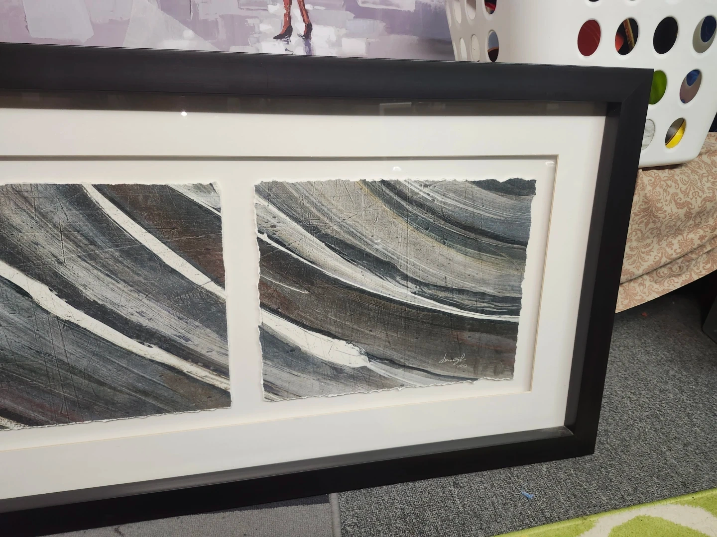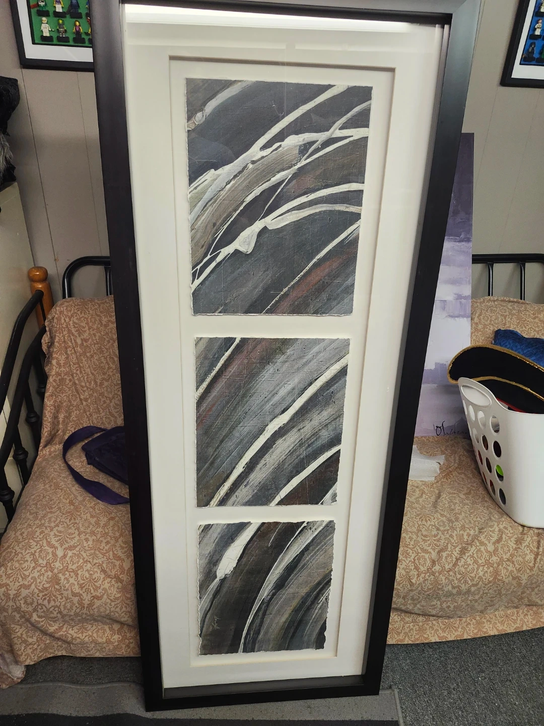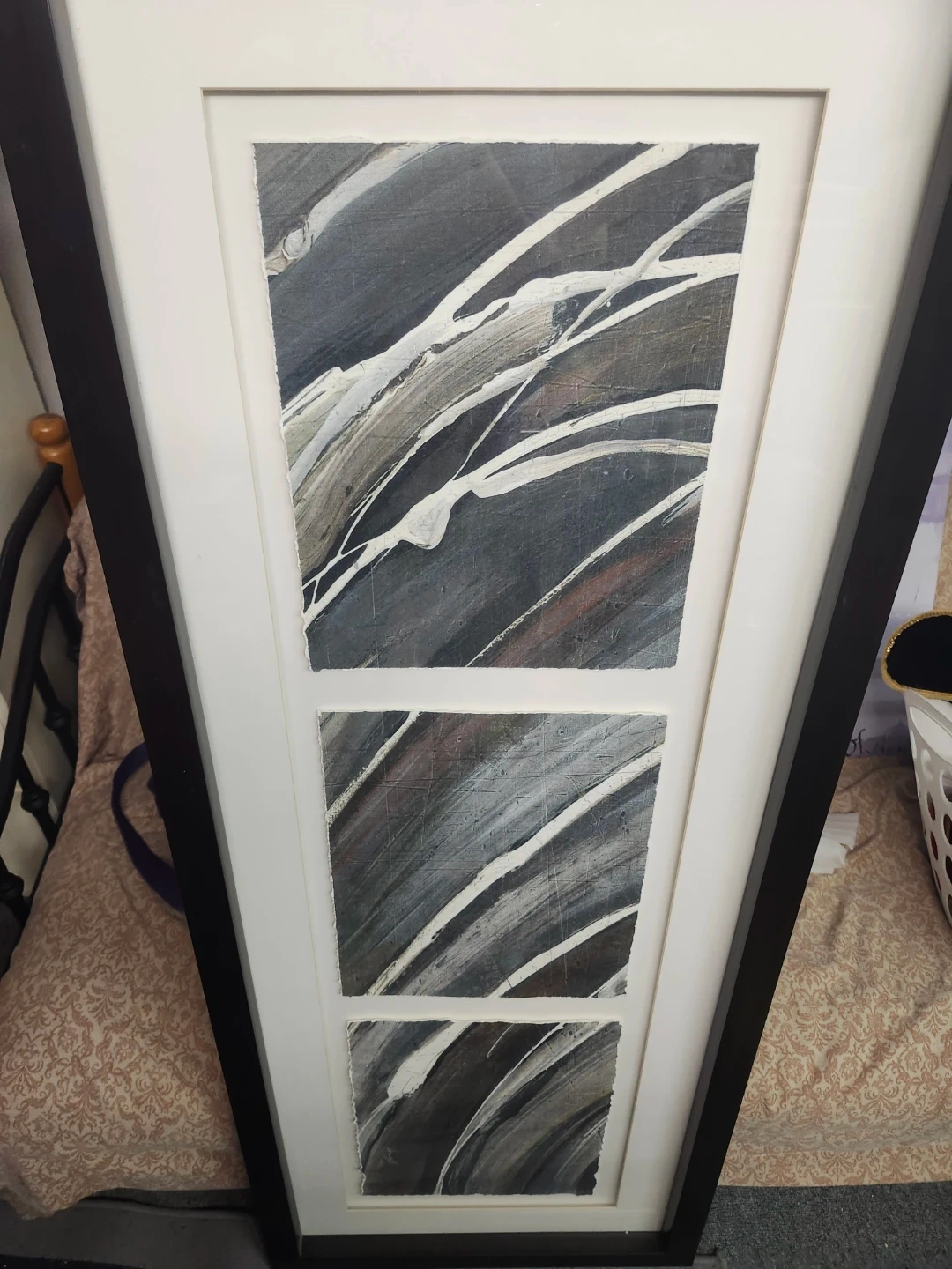 Framed abstract art featuring three panels with a distressed paper edge. It's encased in a black frame with a white matting. This piece would add a modern touch to any room!