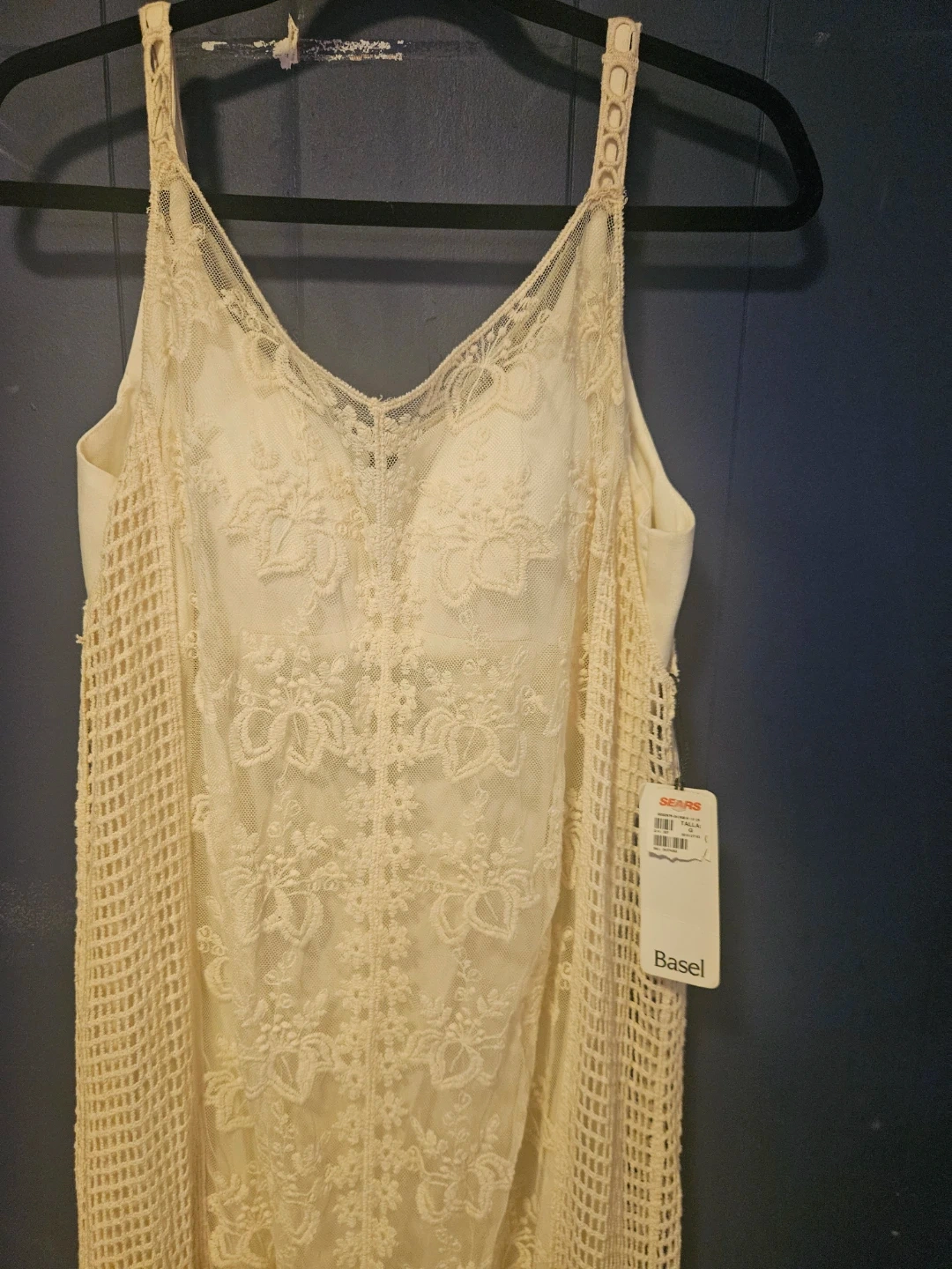 This Basel dress features a cream-coloured lace overlay. It has thin spaghetti straps and a midi length. Size 6.