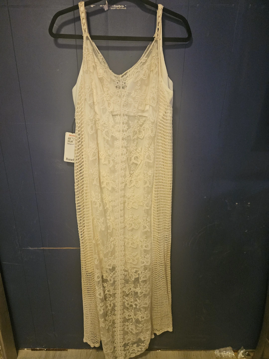 This Basel dress features a cream-coloured lace overlay. It has thin spaghetti straps and a midi length. Size 6.