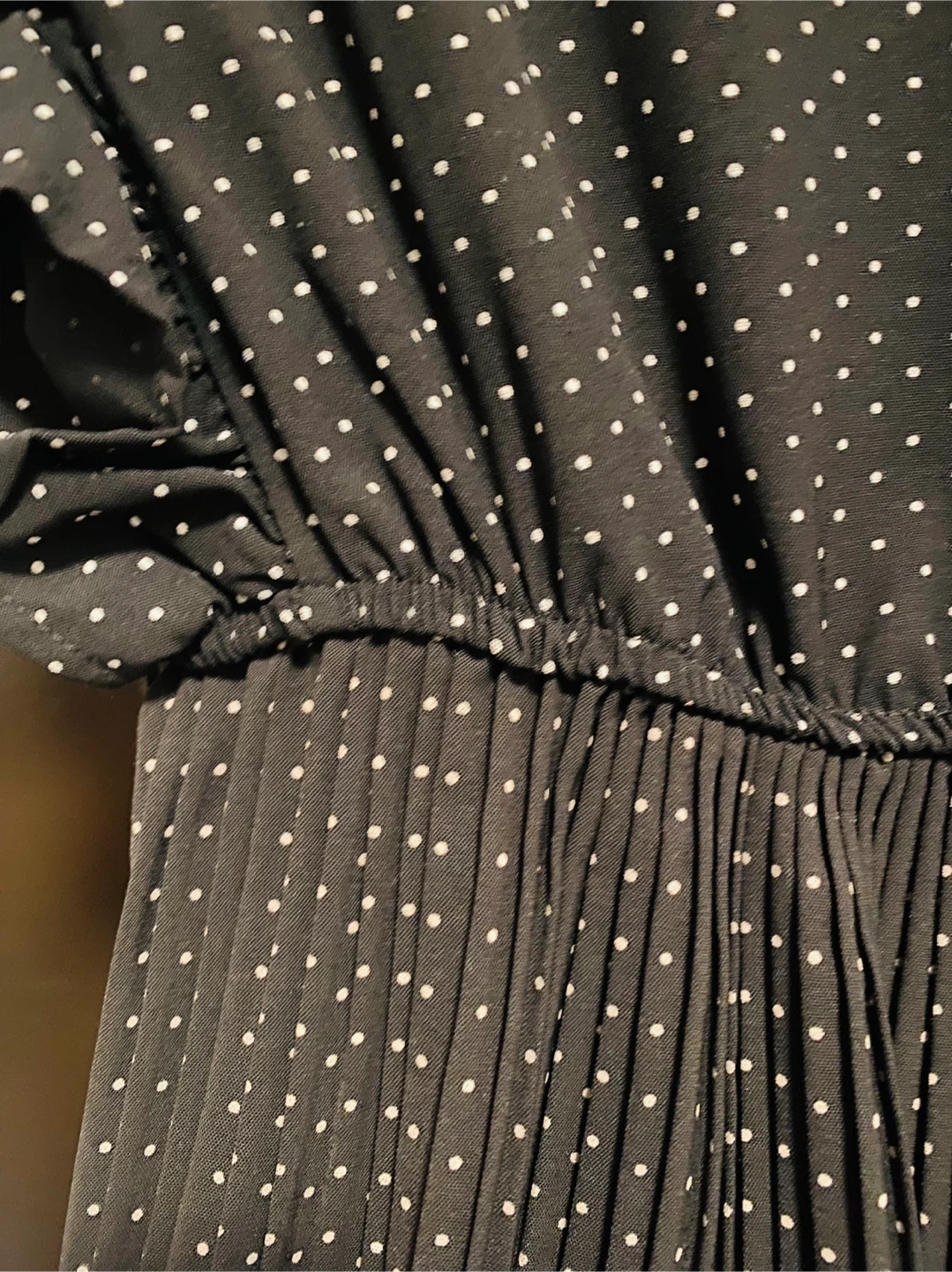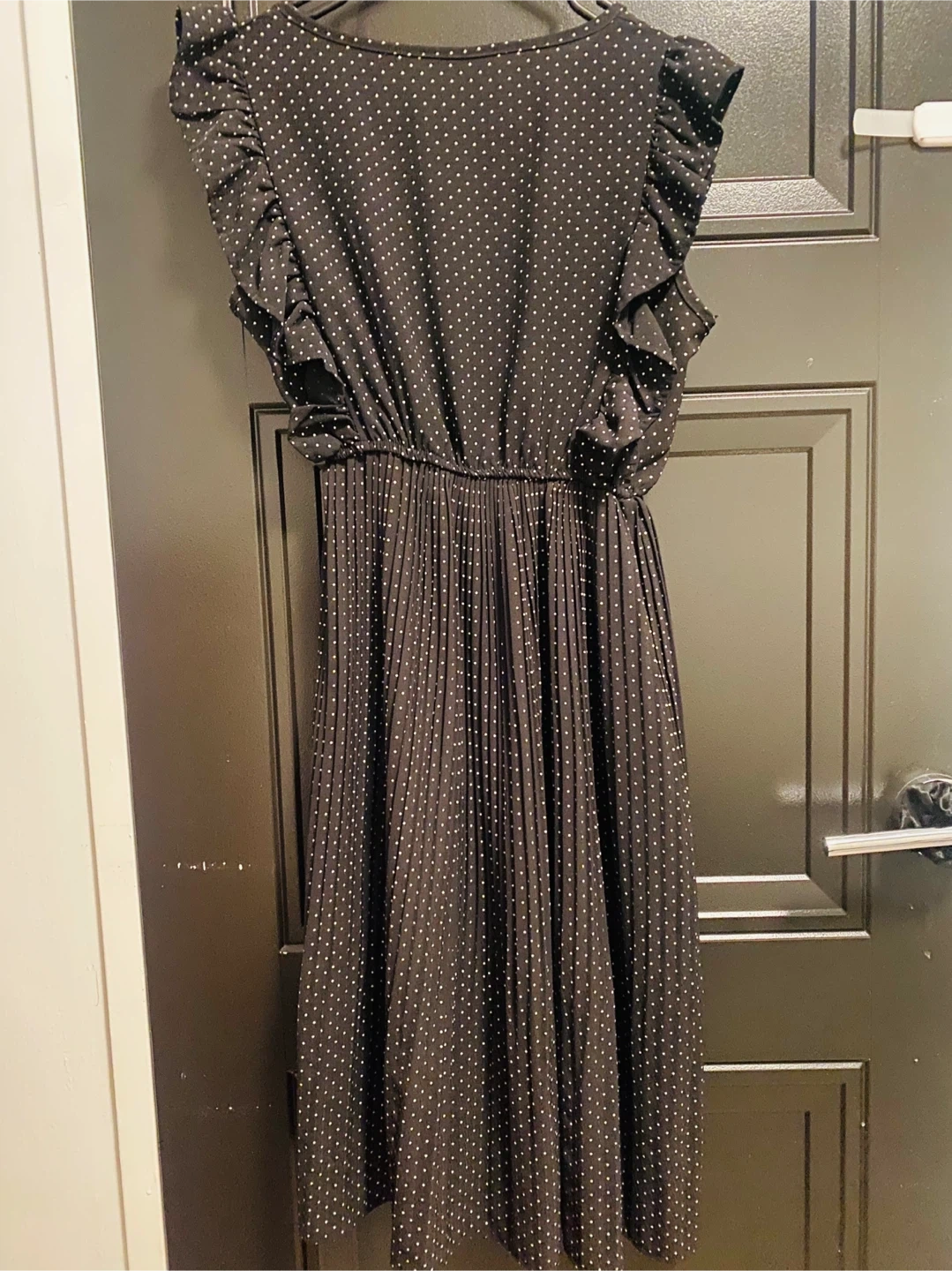 This darling polka dot dress features a flattering cinched waist and a charming tie detail at the neckline. The pleated skirt adds a touch of elegance, and the ruffled sleeves bring a playful, feminine flair. Perfect for any occasion, this gently worn dress is ready for a new home.
