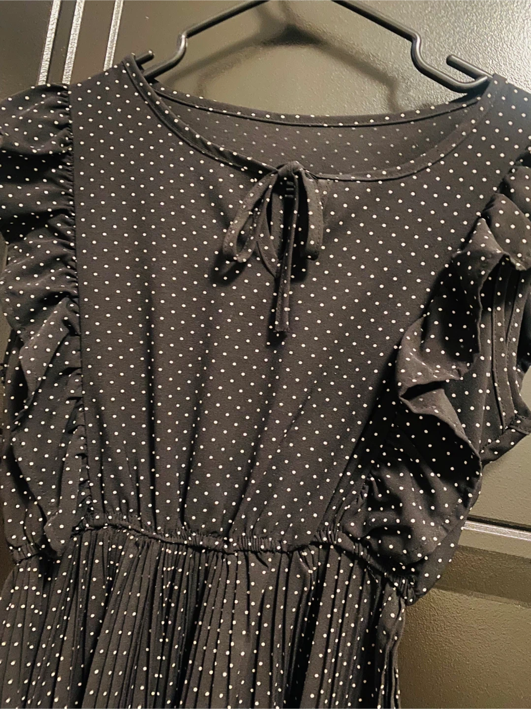 This darling polka dot dress features a flattering cinched waist and a charming tie detail at the neckline. The pleated skirt adds a touch of elegance, and the ruffled sleeves bring a playful, feminine flair. Perfect for any occasion, this gently worn dress is ready for a new home.