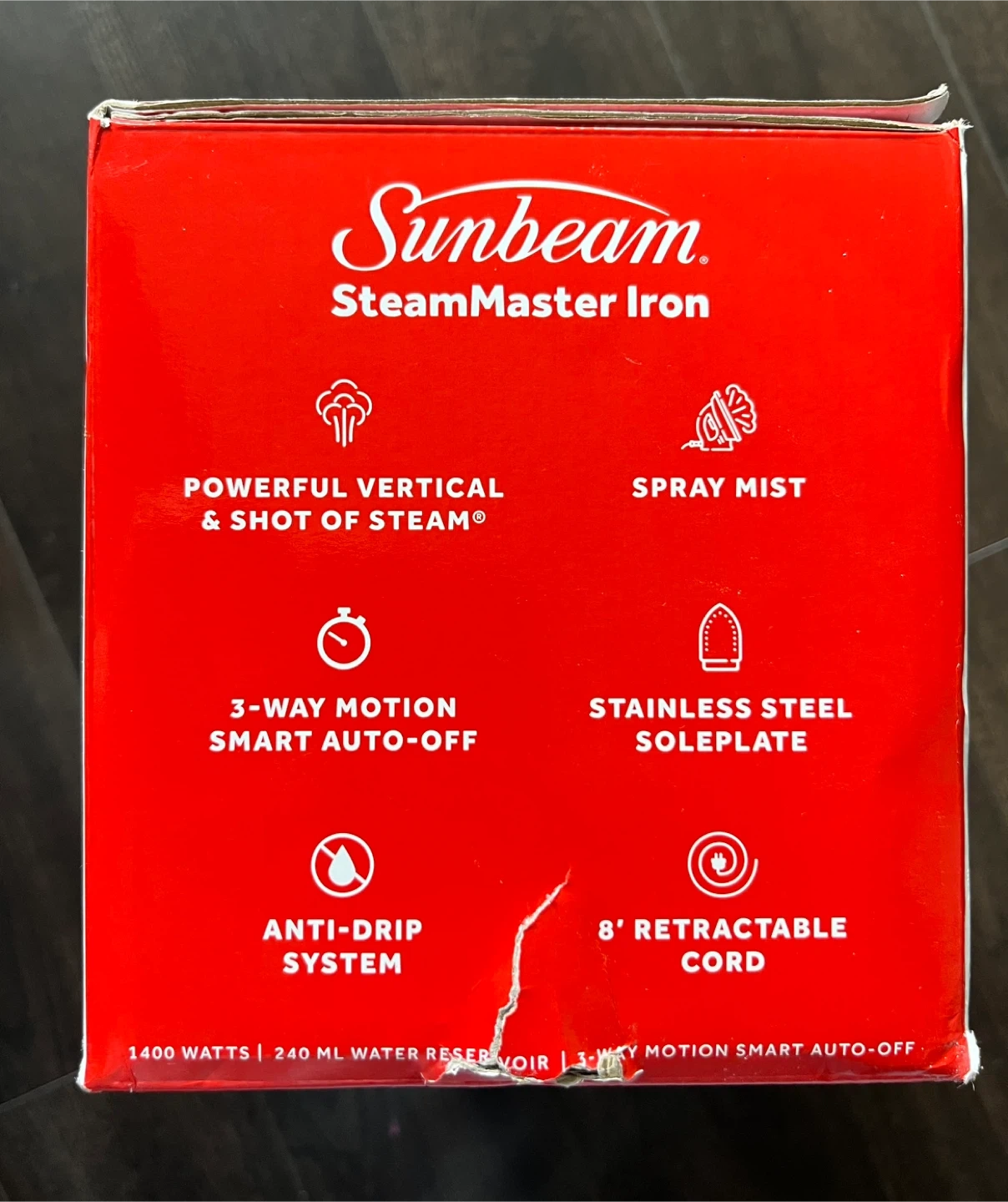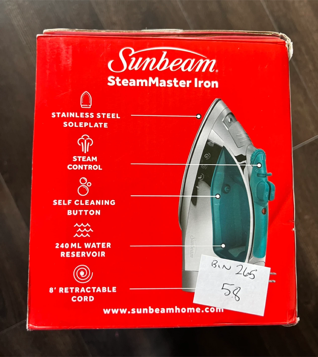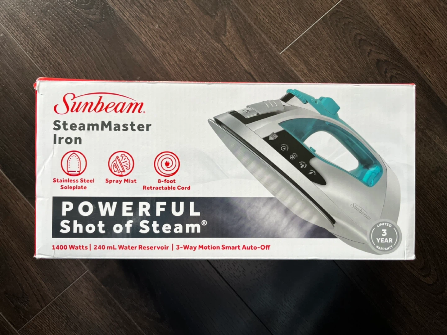 Selling a brand new Sunbeam SteamMaster Iron, still in its original box! It features a stainless steel soleplate, spray mist function, and an 8-foot retractable cord. It also has a powerful shot of steam and a 240 mL water reservoir, plus 3-way motion smart auto-off for safety.