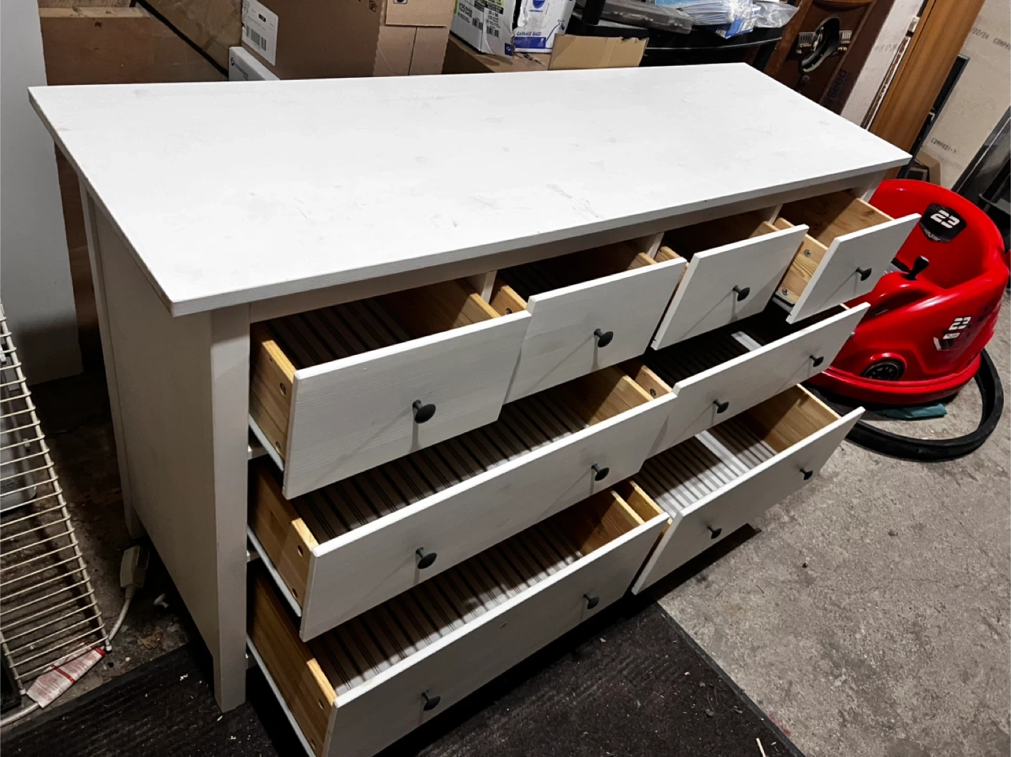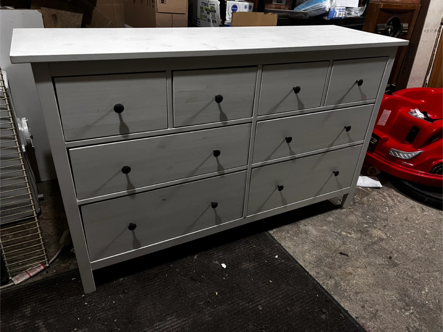 White dresser with nine drawers. Two top drawers are smaller than the seven larger drawers below. Black round knobs on each drawer.
