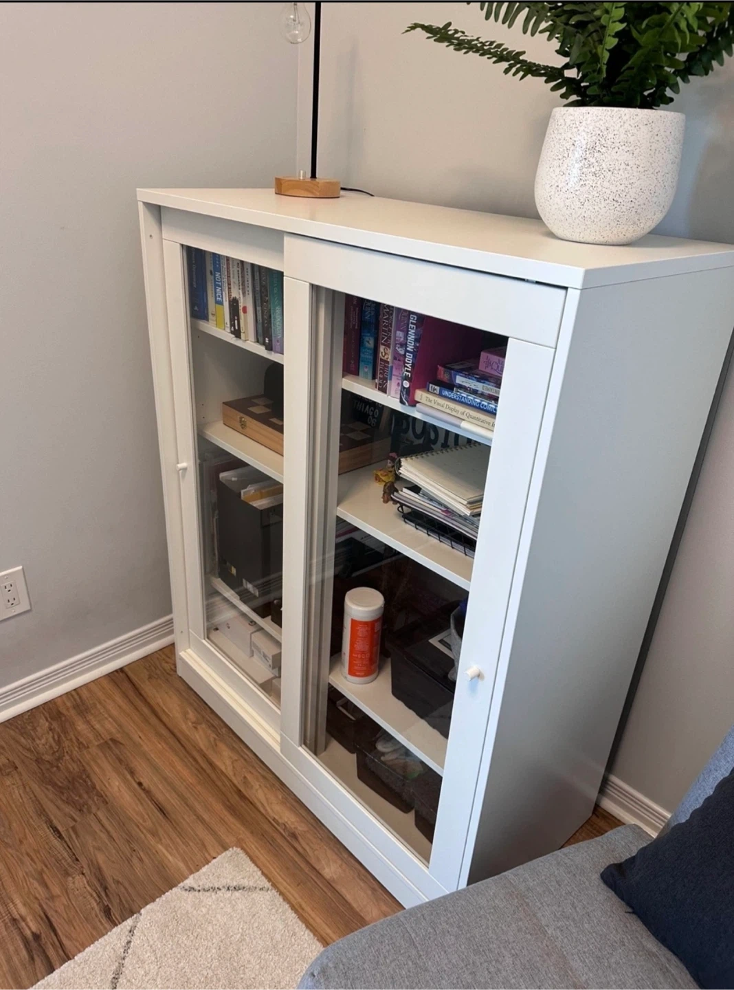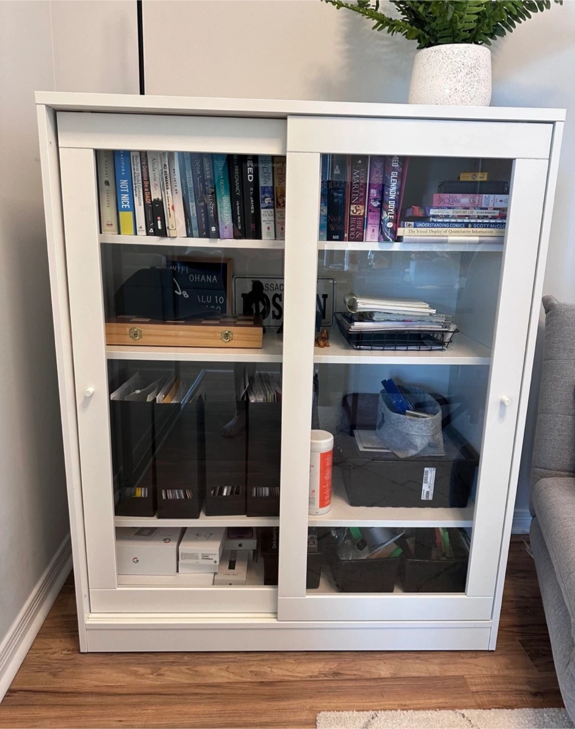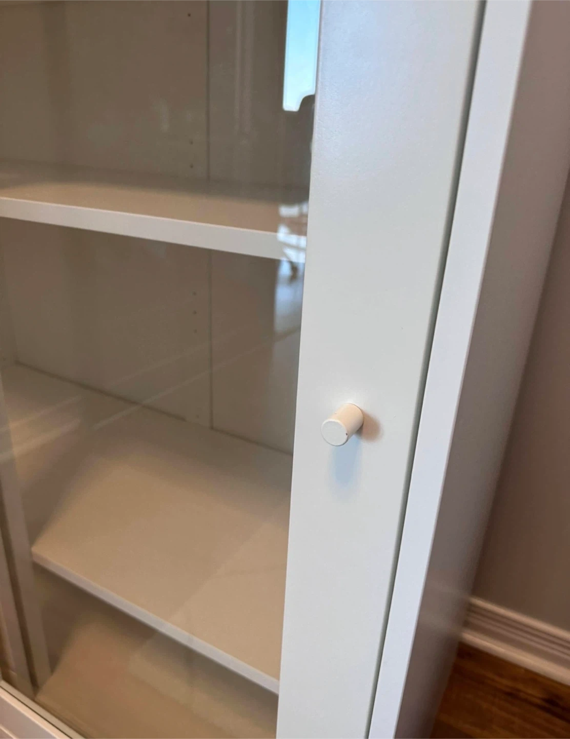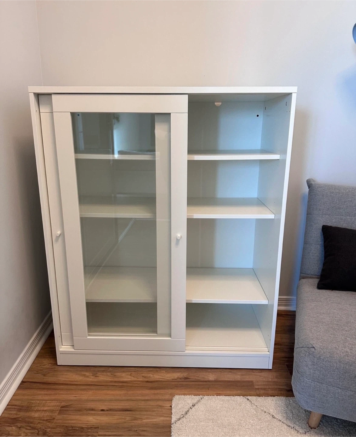 White cabinet, sliding glass doors, 123cmH x 100cmW × 48cmD, adjustable height for shelves, good conditions.