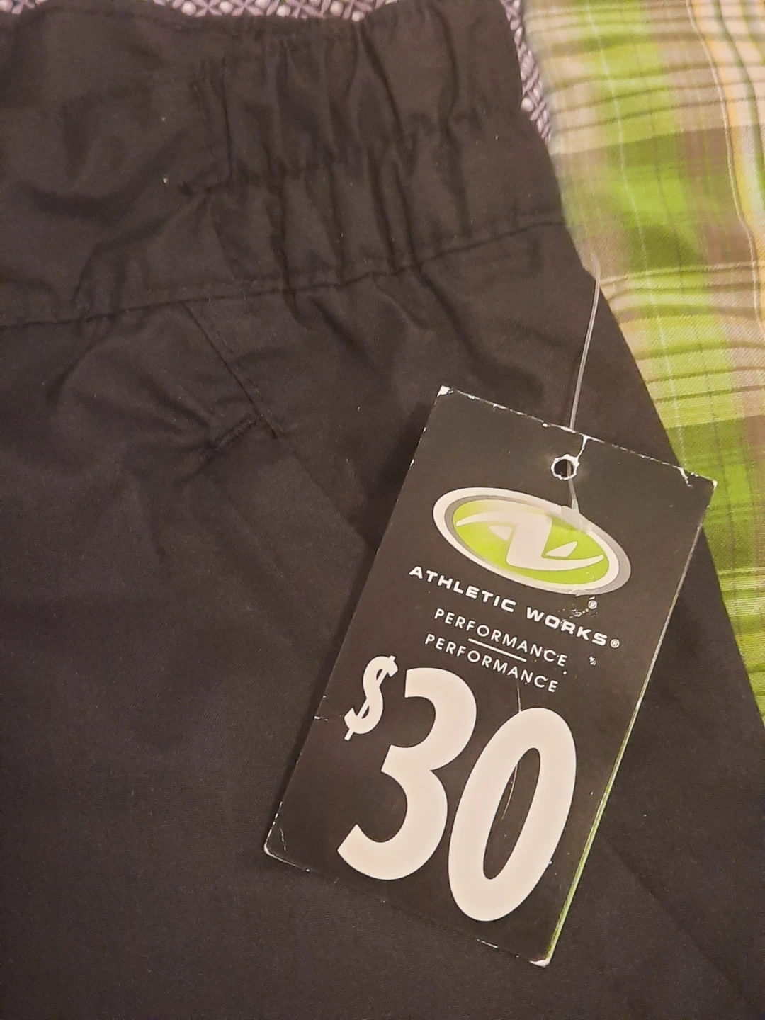 These are a pair of black performance shorts from Athletic Works. The tag is still attached, and it shows they were originally $30!