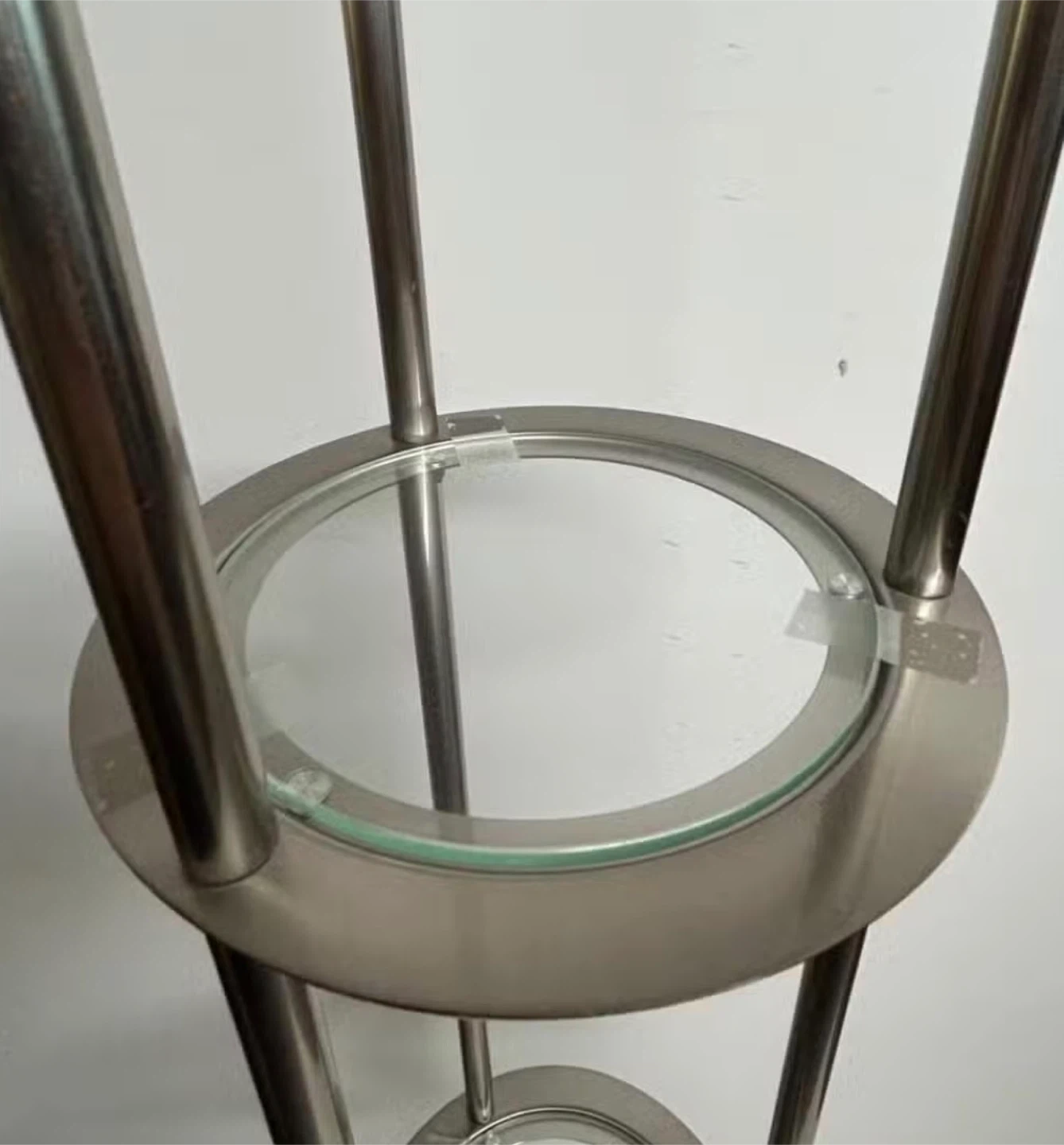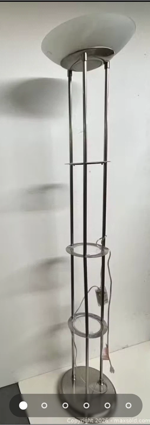 This floor lamp features a sleek brushed nickel finish and a frosted glass shade. It has two clear glass shelves for display or storage. The lamp takes up to 60W bulbs.