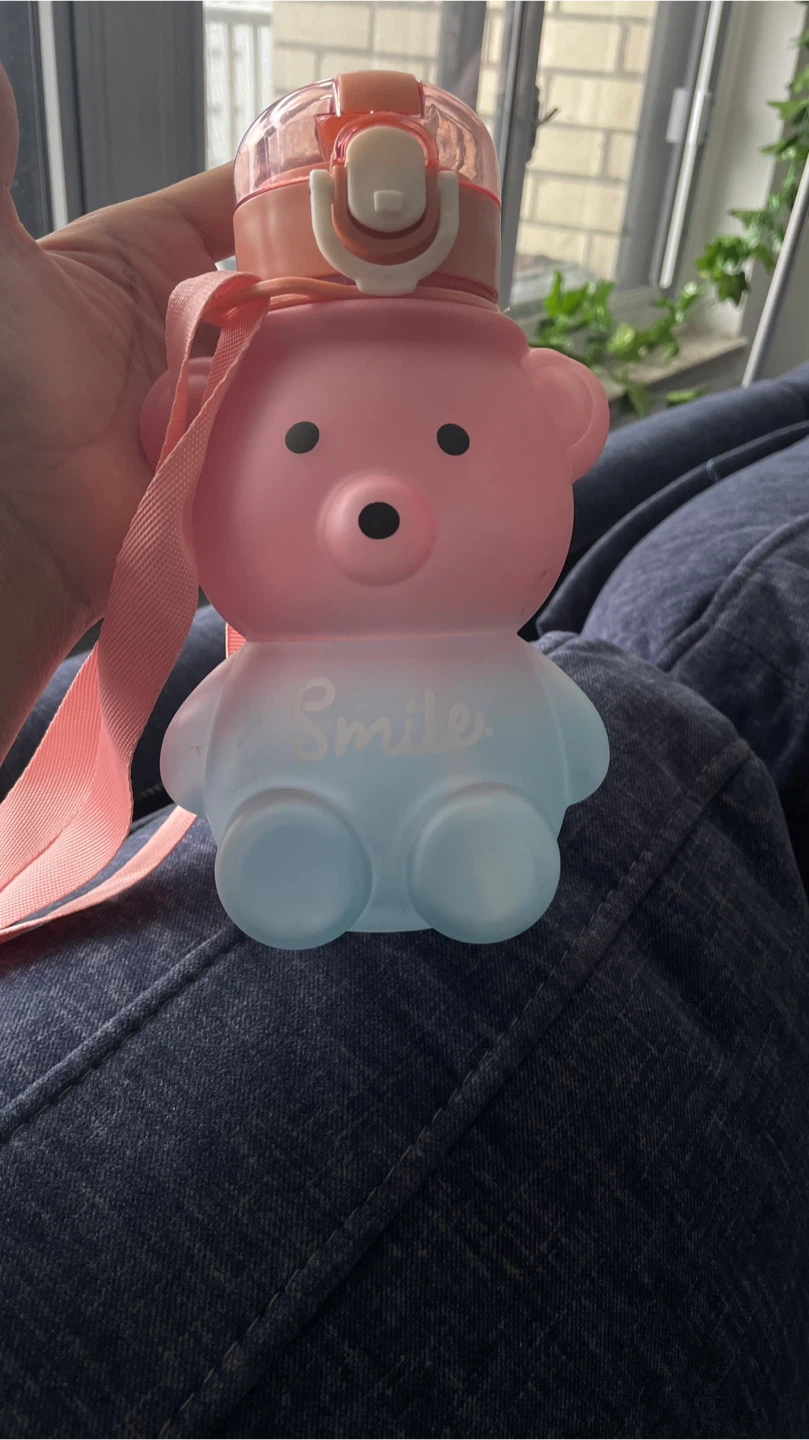 This is a super cute water bottle shaped like a bear! It's got a pink top and light blue bottom, and it even says 'Smile' on it. Perfect for kids or anyone who loves adorable things!