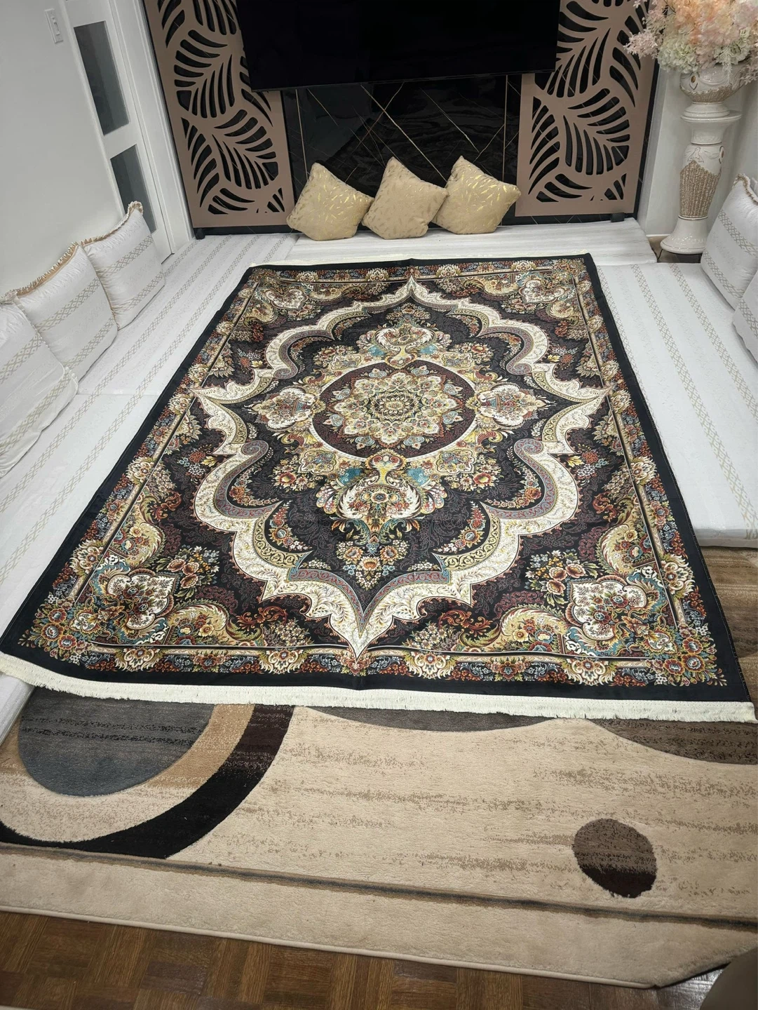A beautiful area rug featuring a traditional Persian design. It has intricate floral patterns and a dark background with colourful accents. This rug would make a lovely addition to any living room or bedroom!