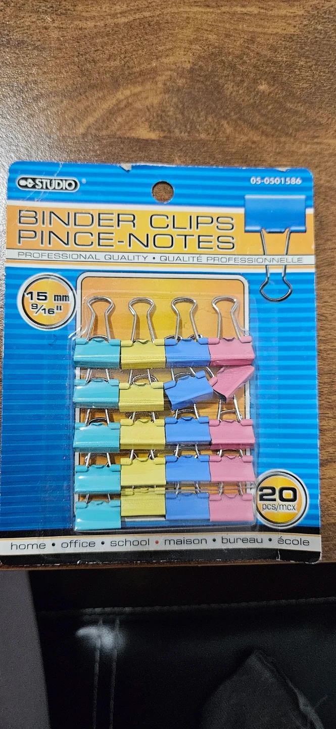 These Studio binder clips come in a pack of 20. They're 15mm or 9/16" in size and come in assorted pastel colours. Great for organizing papers at home, school, or the office!