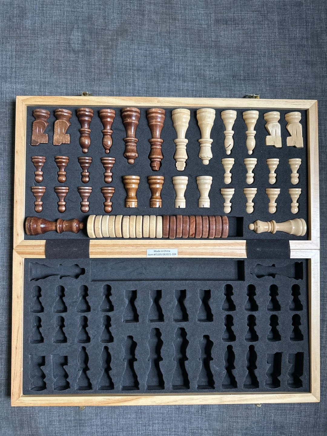 This wooden chess set includes a folding chessboard and all 32 pieces. The board has a wood grain pattern and hinges for easy storage. Pieces are made of wood and have a classic design. This set is great for casual play or travel!